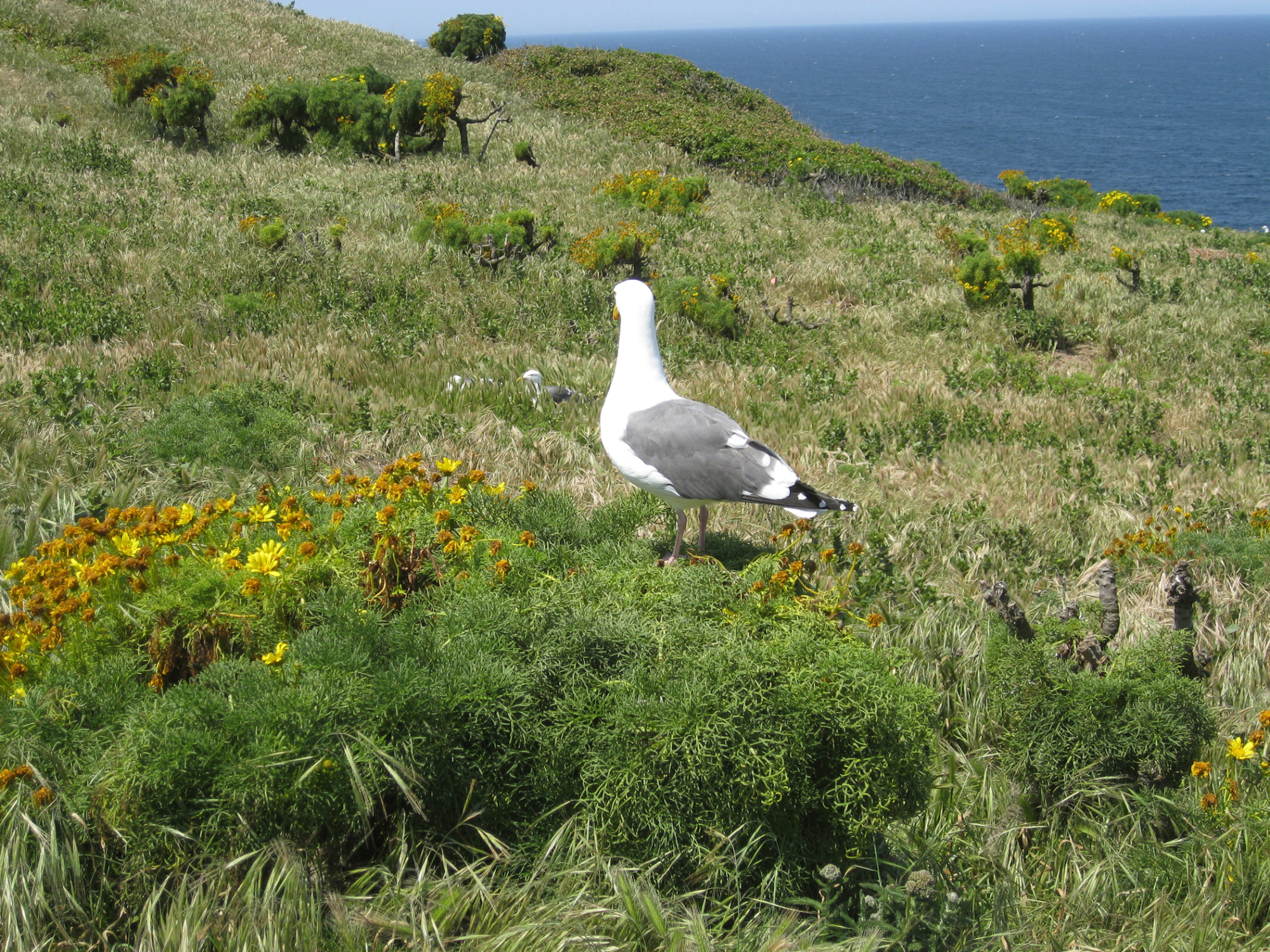 Anacapa Island, western gull setting up territory on Coreopsis gigantea