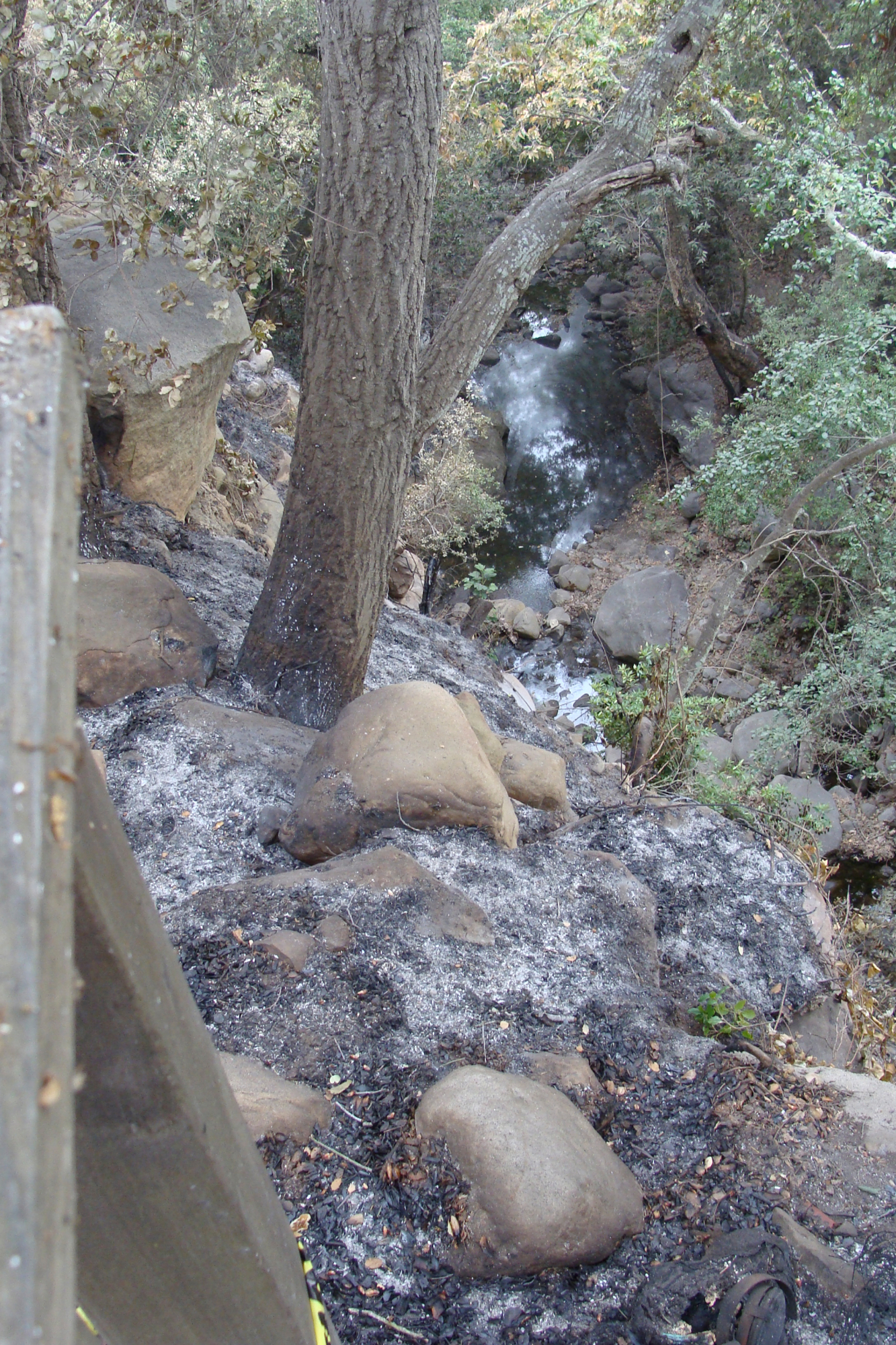 ash along the canyon rim and in Mission Creek, Santa Barbara Botanic Garden, after the Jesusita Fire