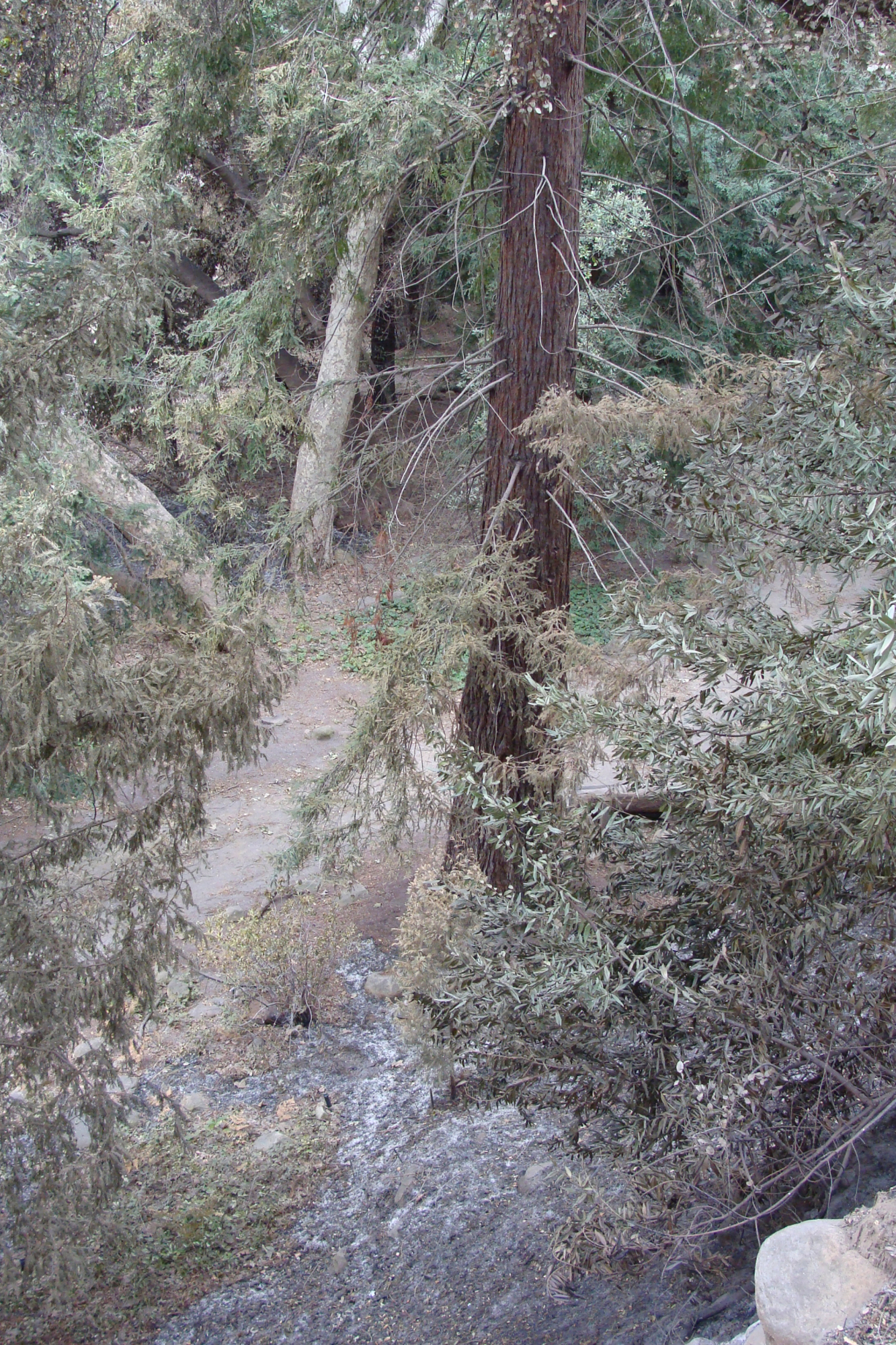 ash at base of singed redwood tree, Santa Barbara Botanic Garden, after the Jesusita Fire