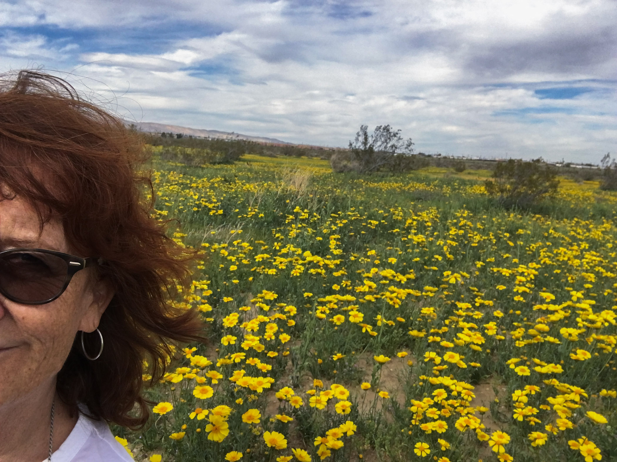 Betsy collins with Monolopia lanceolata wildflowers along Mojave-Tropico Rd in Kern County