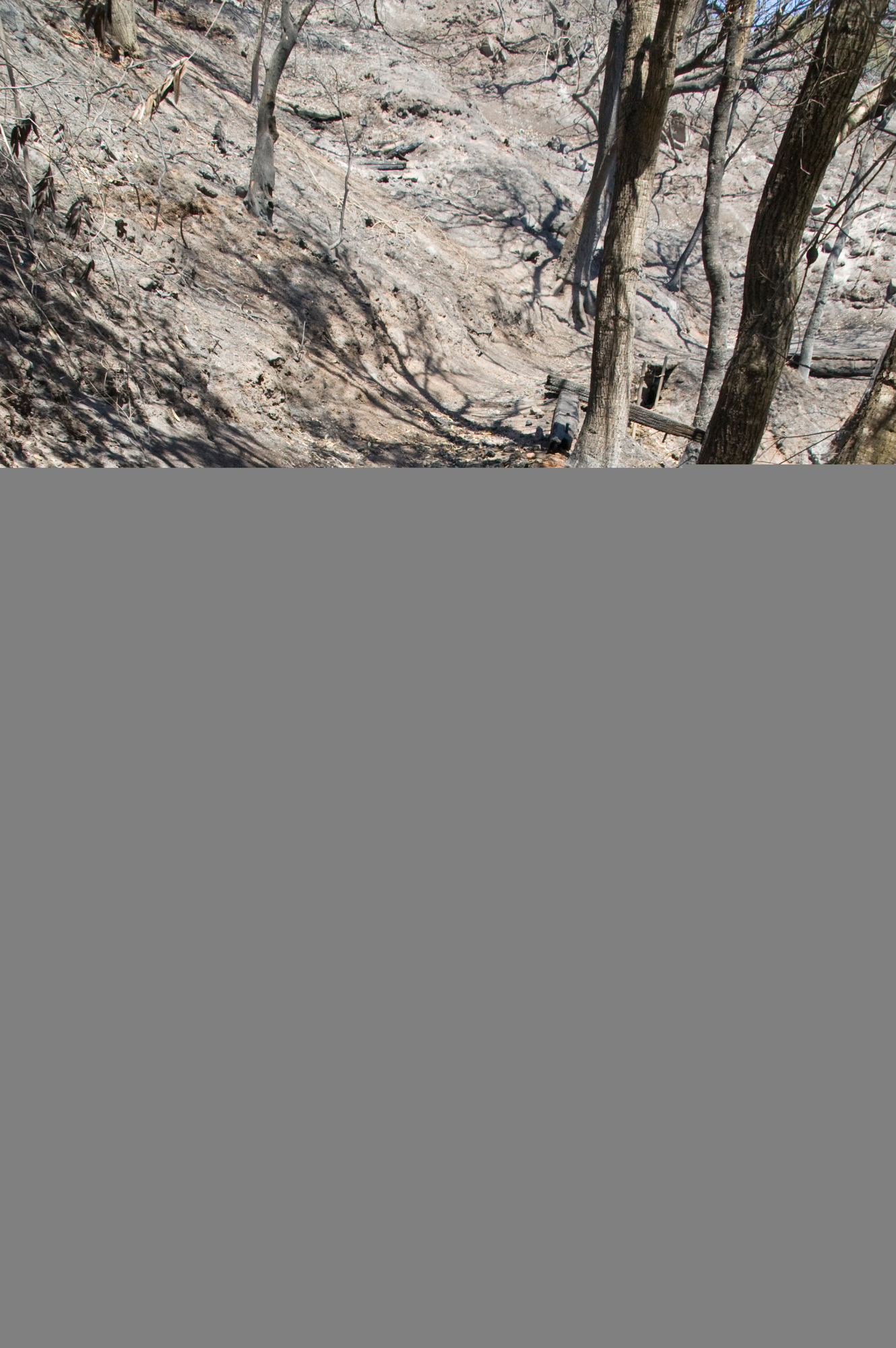 Burned railroad tie retaing wall on Pritchett Trail after the Jesusita Fire