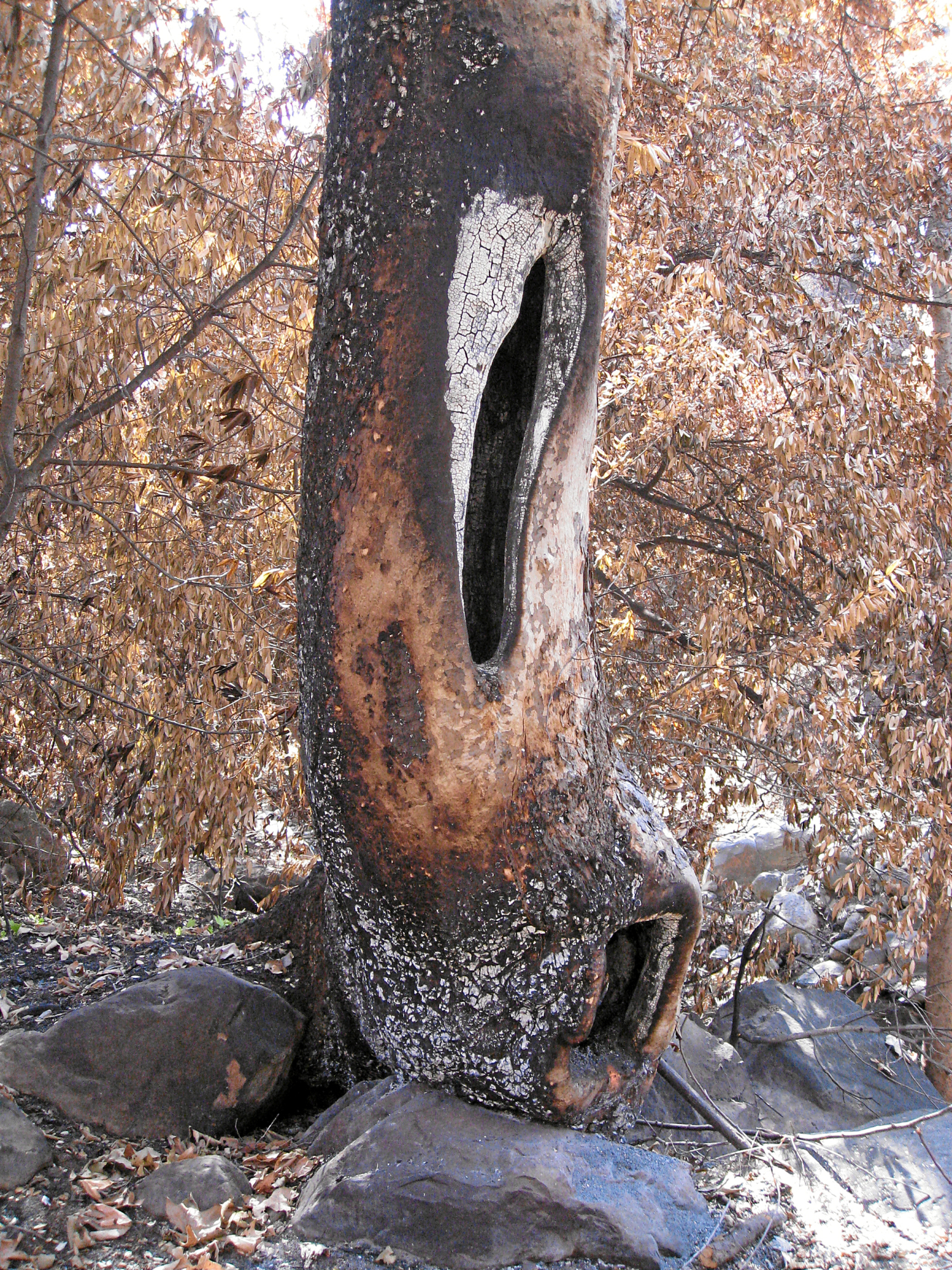 Burned sycamore trunk along Mission Creek after the Jesusita Fire