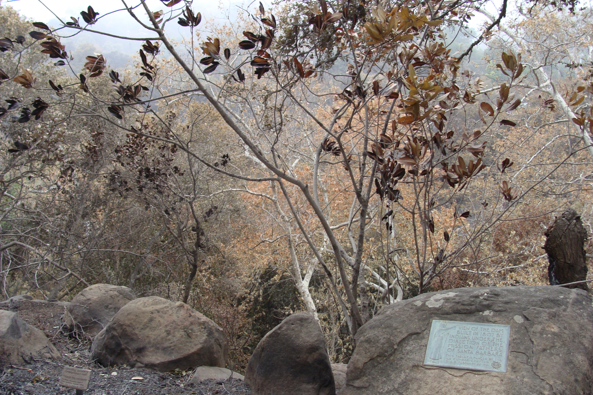 burned vegetation at the eastern rim of Mission Canyon, Santa Barbara Botanic Garden, after the Jesusita Fire