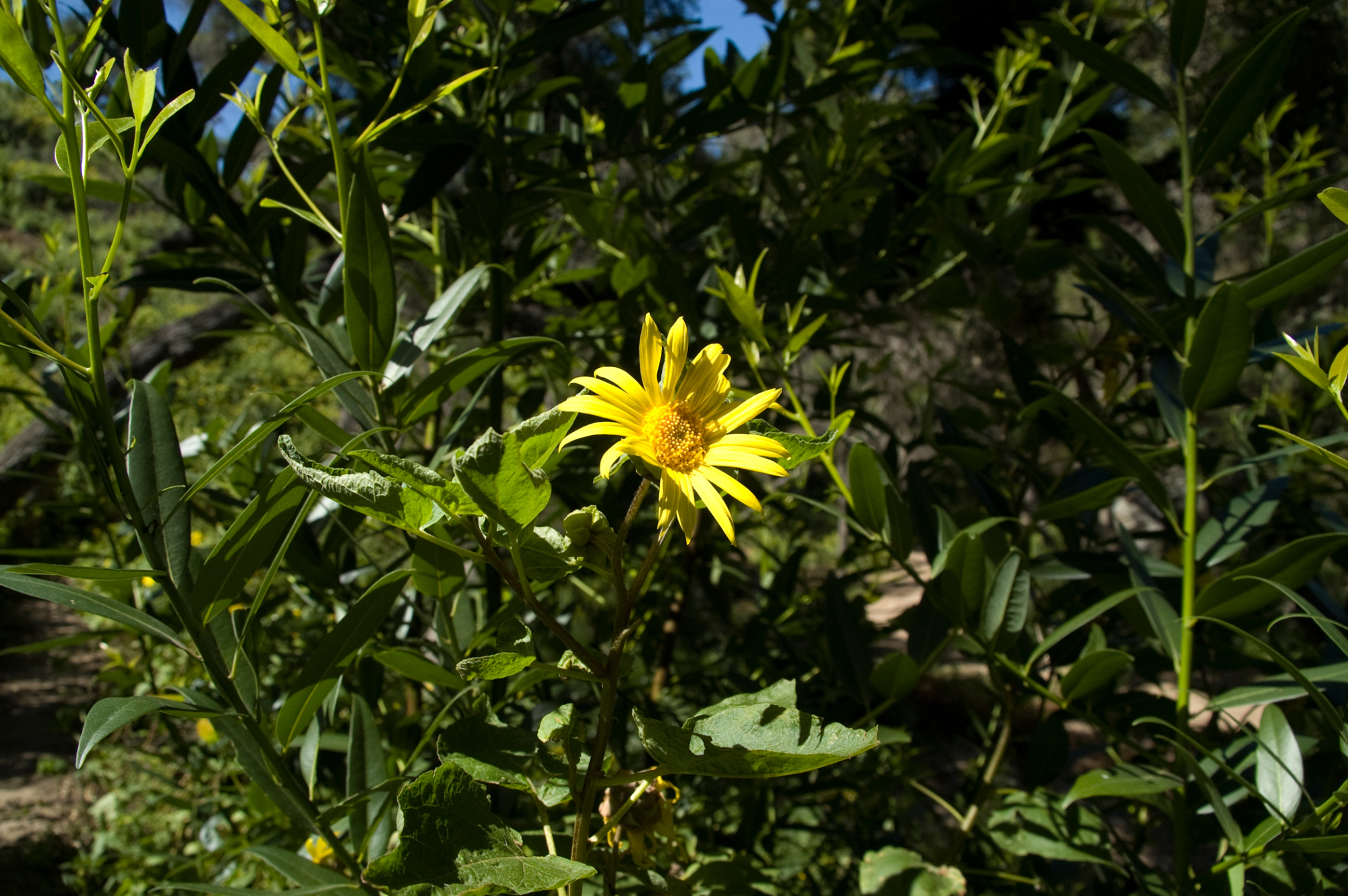 « back to search Canyon sunflower in bloom, SBBG 2 years after the Jesusita Fire Date April 27, 2011 Media FormatBorn Digital PhotographerTricia Wardlaw Location Information Place Name Santa Barbara Botanic Garden Country: United States State: California County: Santa Barbara Plant Information Plant(s) Pictured Canyon Sunflower (Venegasia carpesioides) More Info Alternative Common NamesSunflower, Canyon Native StatusNative Plant Type/Growth Formperennial herb Blooming PeriodWinter, Spring Plant Communities Chaparral, Venegasia carpesioides, Woodland, Chaparral, Coastal Sage Scrub, Southern Oak Woodland Flower Color Yellow Primary Plant Part Flower Close-up, Whole Plant Image & Format Details Decade2010s Photo OrientationLandscape Image & Format Tags Color photograph Collection Tricia Wardlaw Collection Index NumberBD_08334