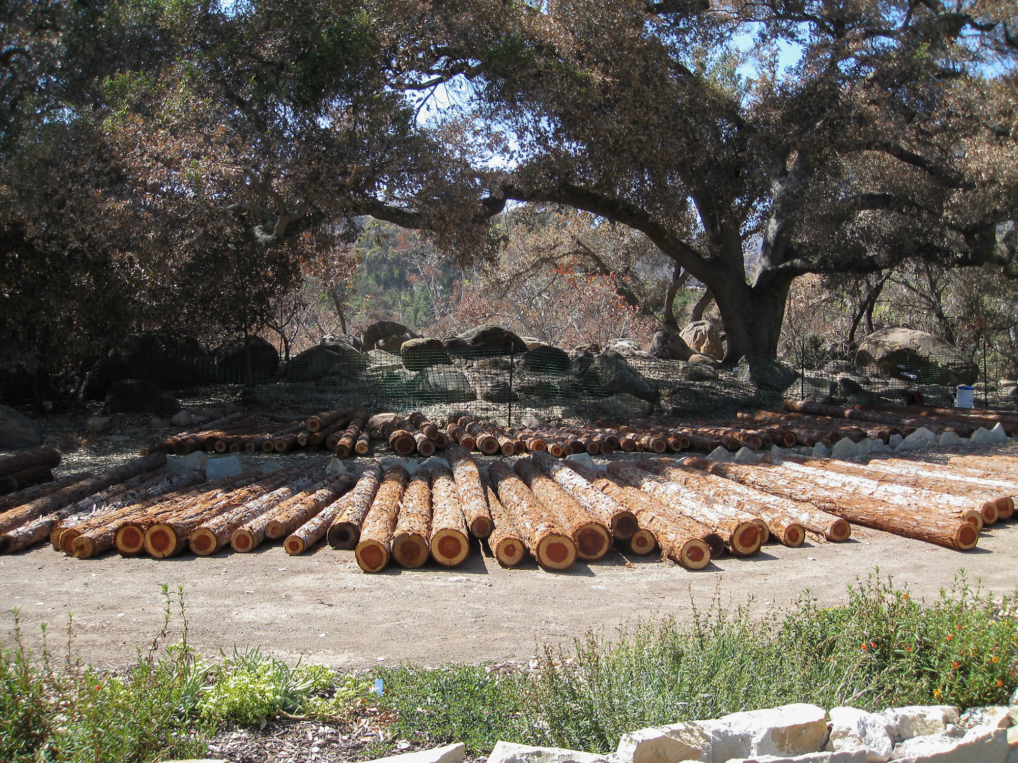 Construction of Herb Parker's 'Haven' labyrinth, Redwood logs from Restoration Forest Project at Meadow Terrace