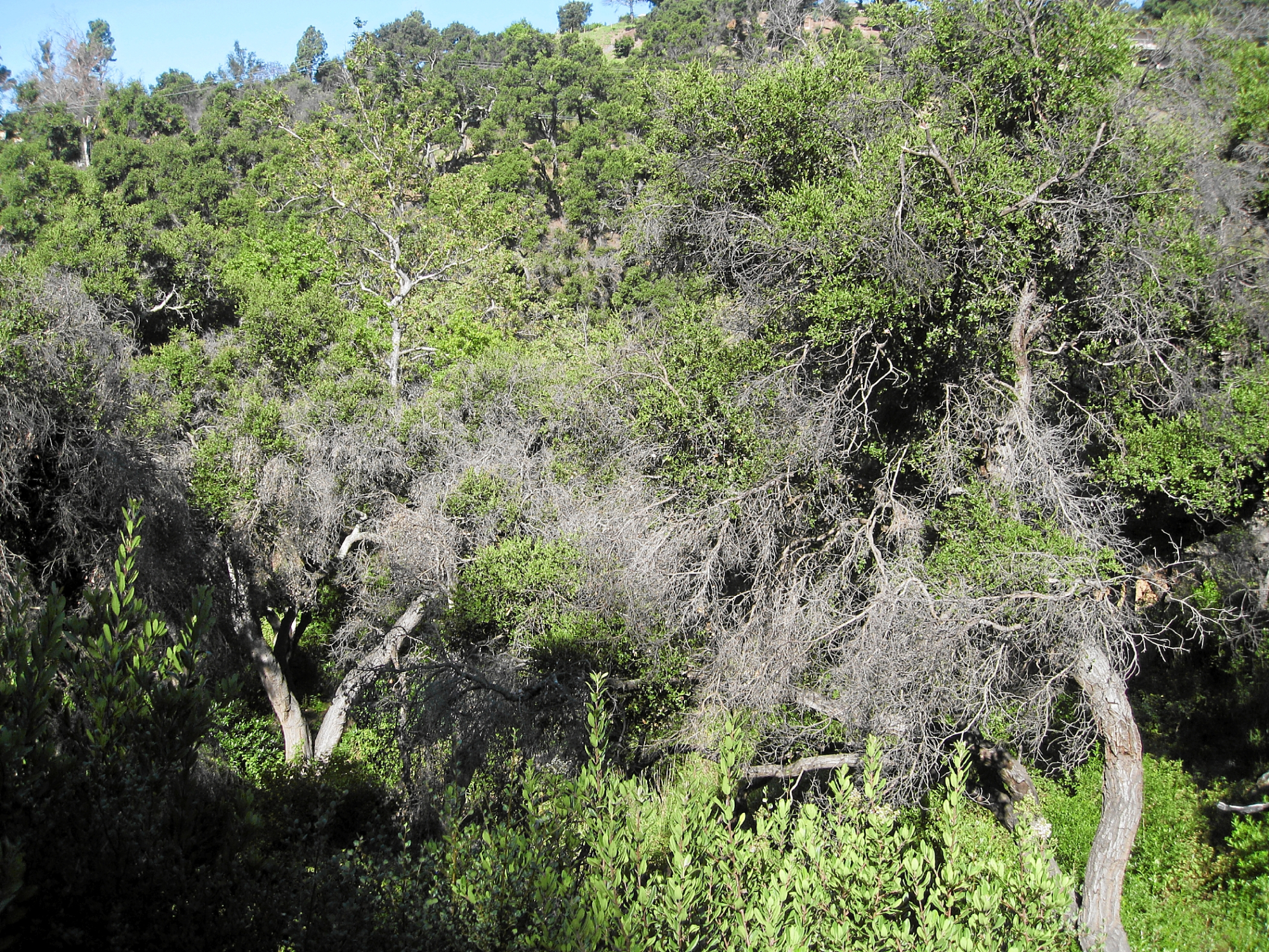 Dead branches on oaks in the canyon post fire