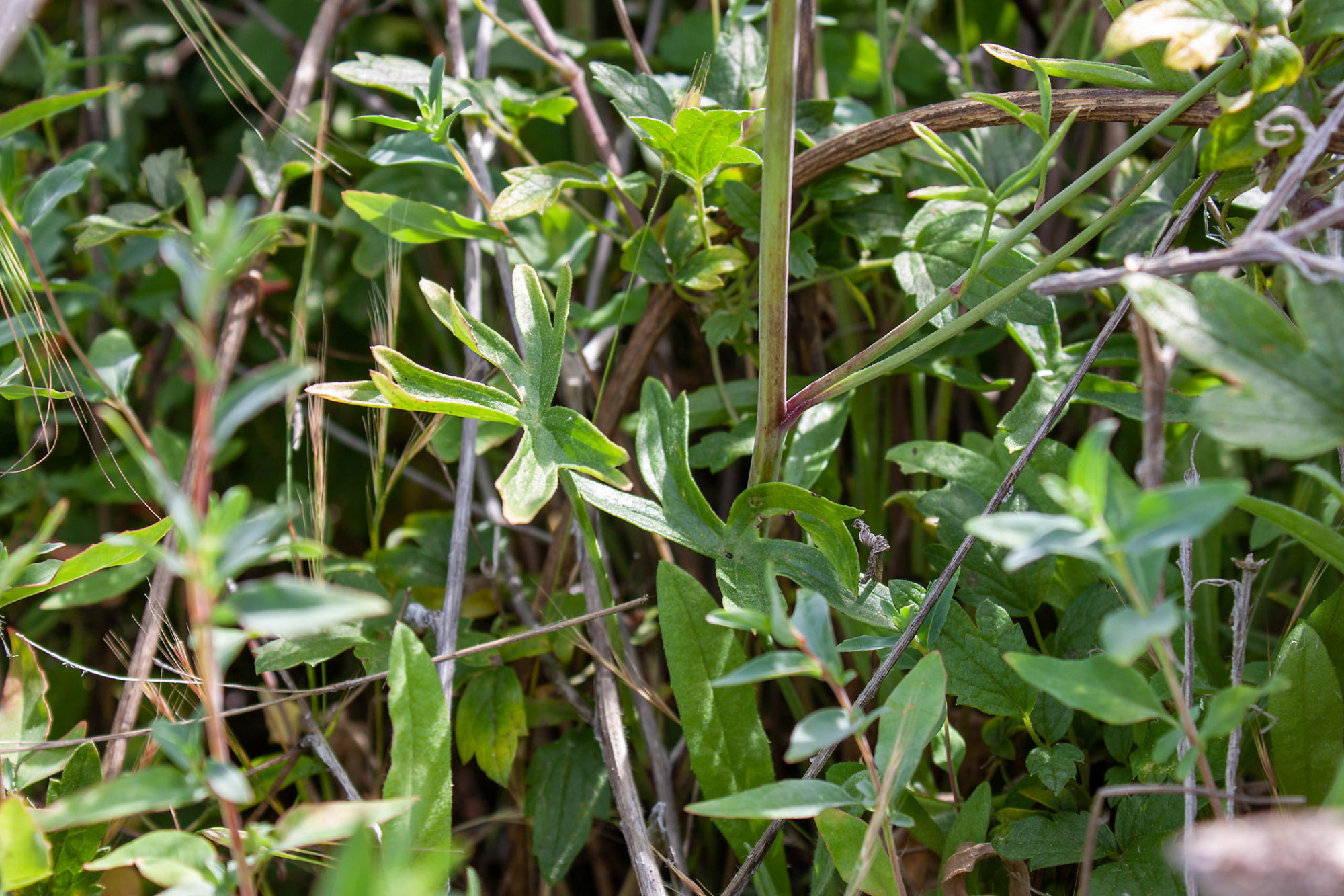 Delphinium (larkspur) leaves in post-burn chaparral, Murietta Rd (5N13), Ojai, CA, Thomas Fire Survey - Mapping Recovery project
