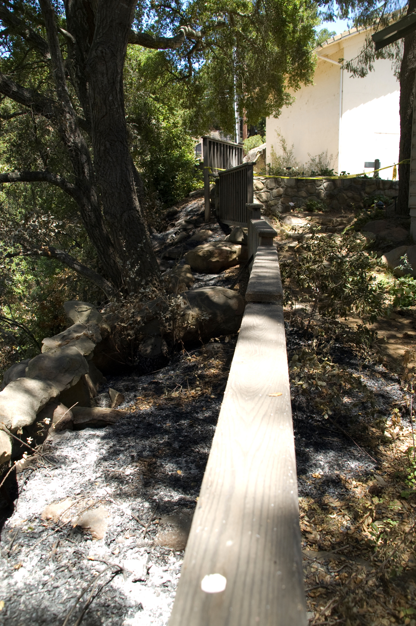 how close the fire got, railing at canyon rim, adjacent to the Cottage and Herbarium building, after the Jesusita Fire