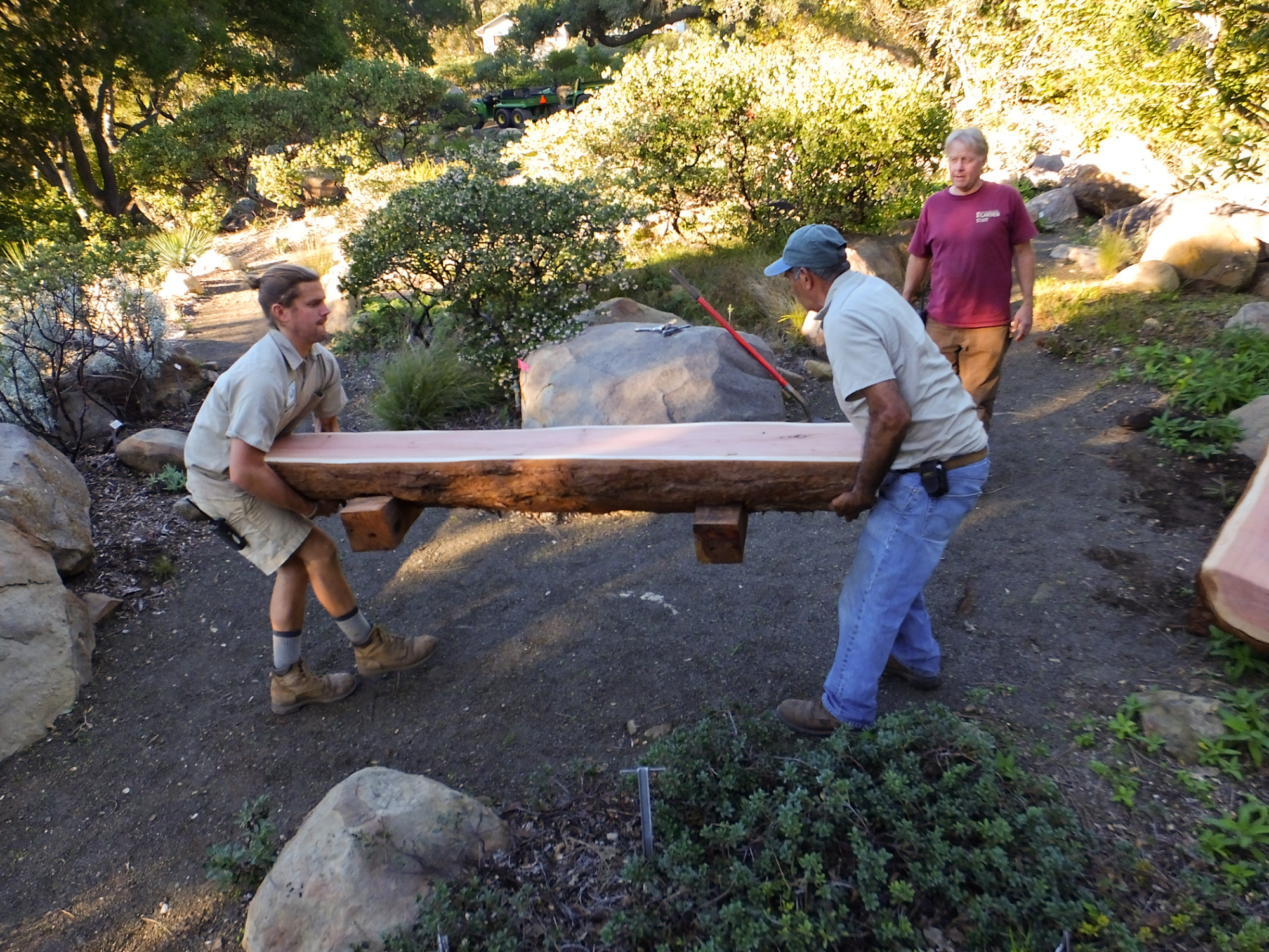Installation of the Bobbie Jones bench, made from the giant sequoia removed from the Arroyo Section