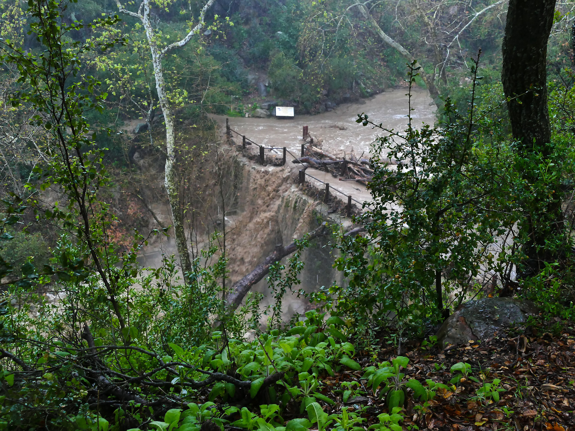 Mission Creek cresting Mission Dam during rainstorm