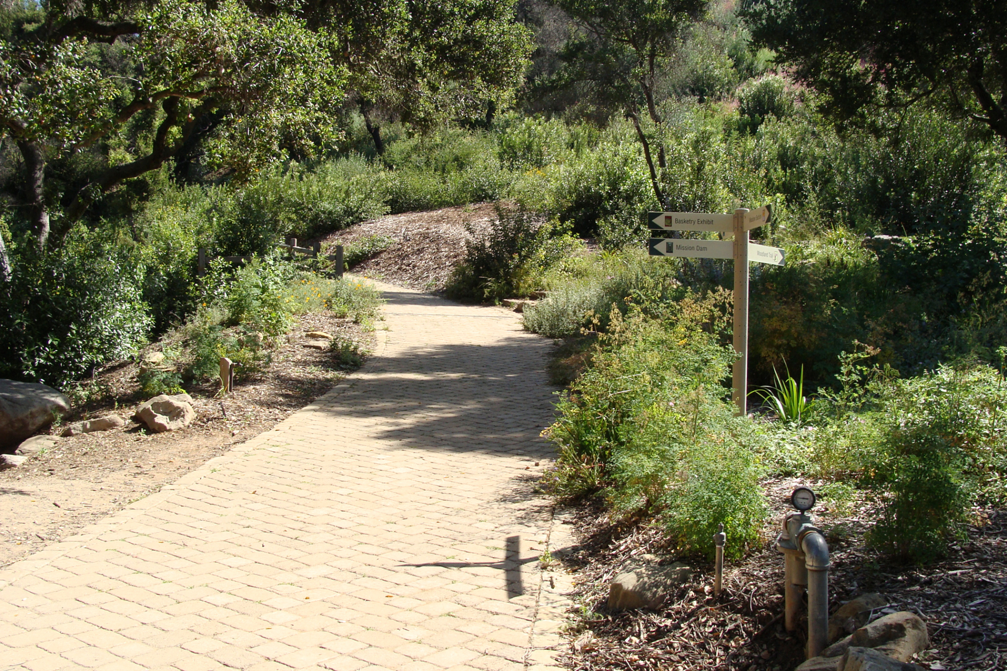 pavered path to the Redwood Section and the Woodland Trail at the top of the Meadow, directional sign, SBBG 2 years after the Jesusita Fire