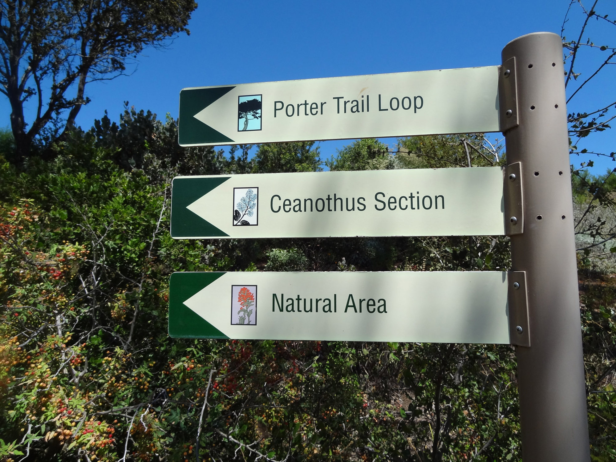 « back to search Porter Trail Ceanothus Section, Nature Loop way signs Date June 22, 2012 Media FormatBorn Digital PhotographerTricia Wardlaw Location Information Place Name Santa Barbara Botanic Garden Country: United States State: California County: Santa Barbara Santa Barbara Botanic Garden Garden Section/Display Porter Trail, Ceanothus Garden Display/Feature Signage Planted Landscapes/Horticultural Uses Garden Name (not SBBG)Santa Barbara Botanic Garden General Subject Subject Tags Trail Image & Format Details Decade2010s Photo OrientationLandscape Image & Format Tags Color photograph Collection Tricia Wardlaw Collection Index NumberBD_11567