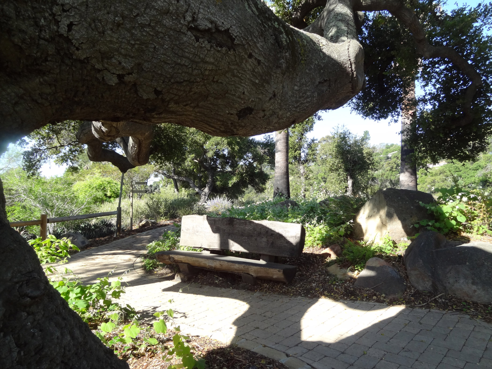 Quercus agrifolia (Coastal Live Oak), wood bench