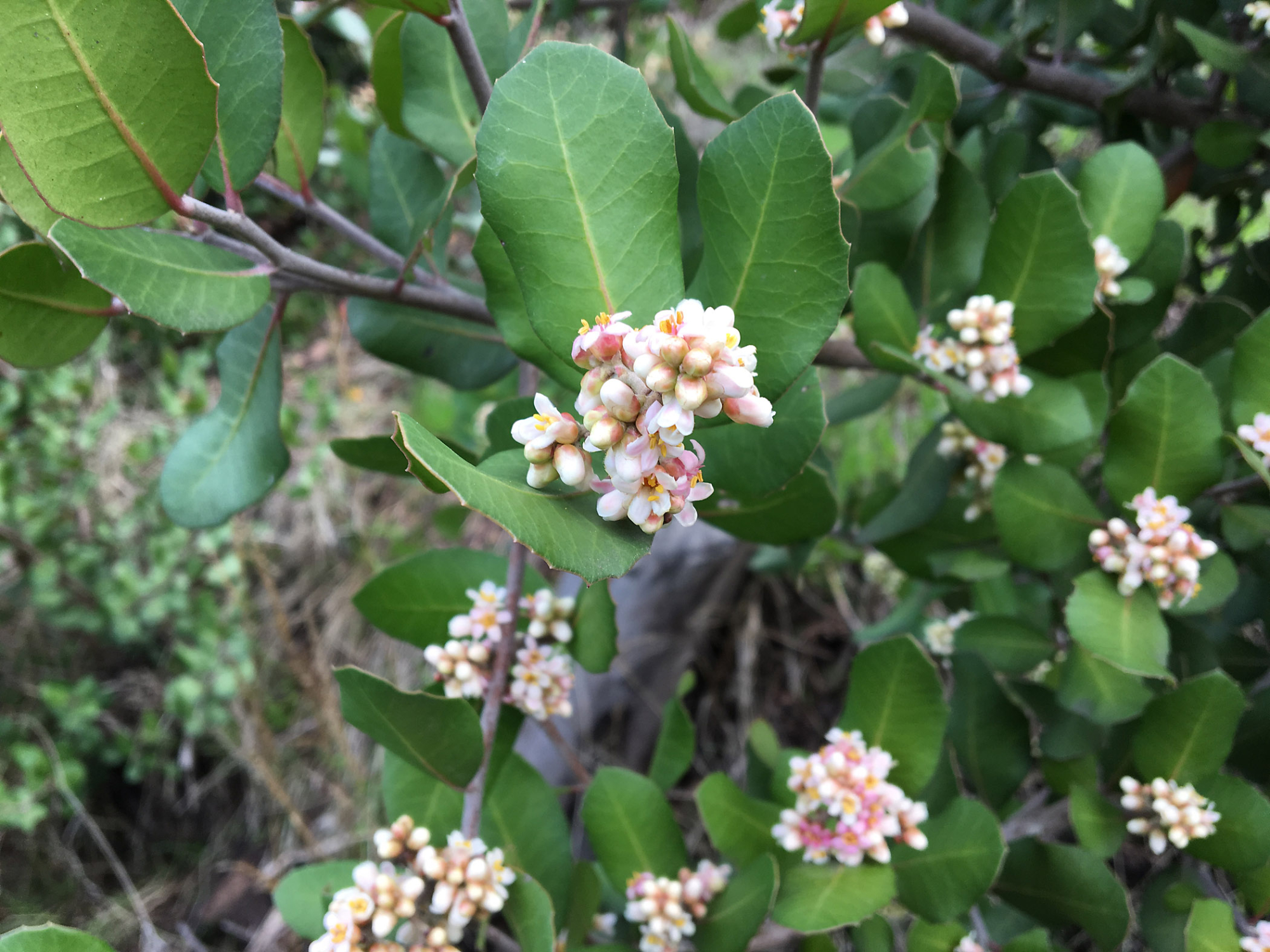« back to search Rhus integrifolia, close-up of flowers Date January 10, 2017 Media FormatBorn Digital PhotographerElizabeth (Betsy) Collins Location Information Place Name Santa Barbara Botanic Garden Country: United States State: California County: Santa Barbara Plant Information Plant(s) Pictured Lemonade Berry (Rhus integrifolia) Šmuwič (Barbareño)walqaqsh More Info Alternative Common NamesSumac, Lemonade, Lemonade Sumac Native StatusNative Plant Type/Growth FormShrub Blooming PeriodSpring, Winter Plant Communities Chaparral, Rhus integrifolia, Woodland, Chaparral, Rhus integrifolia, Foothill Woodland, Lowland Chaparral, Montane Chaparral, Southern Coastal Scrub Flower Color Pink, White Primary Plant Part Flower Close-up, Leaves Image & Format Details Decade2010s Photo OrientationLandscape Image & Format Tags Color photograph Collection SBBG Born Digital Image Collection Index NumberBD_33439