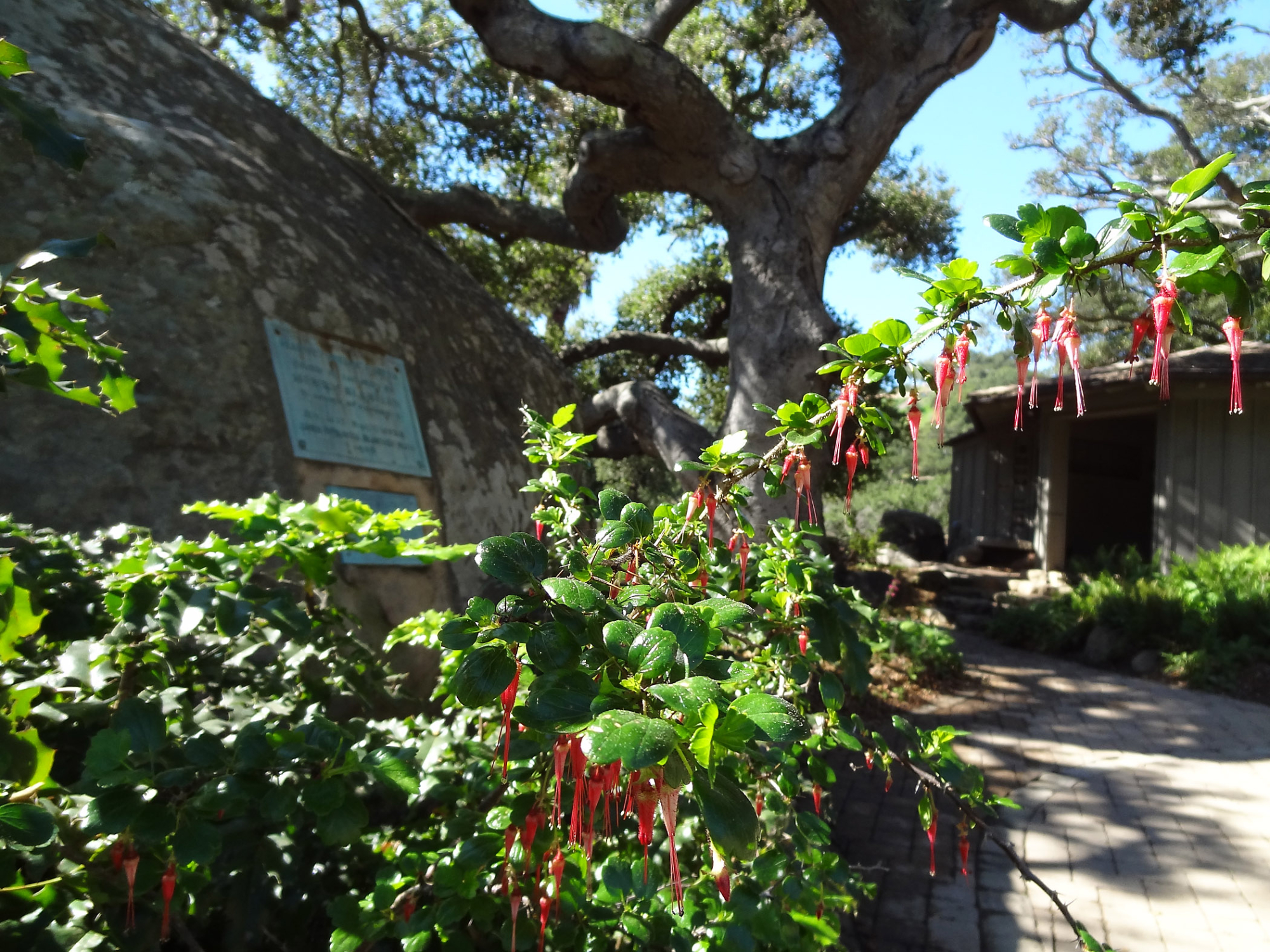 Ribes speciosum blooming by the Blaksley Boulder, Spring in the Garden, February 2013, SBBG