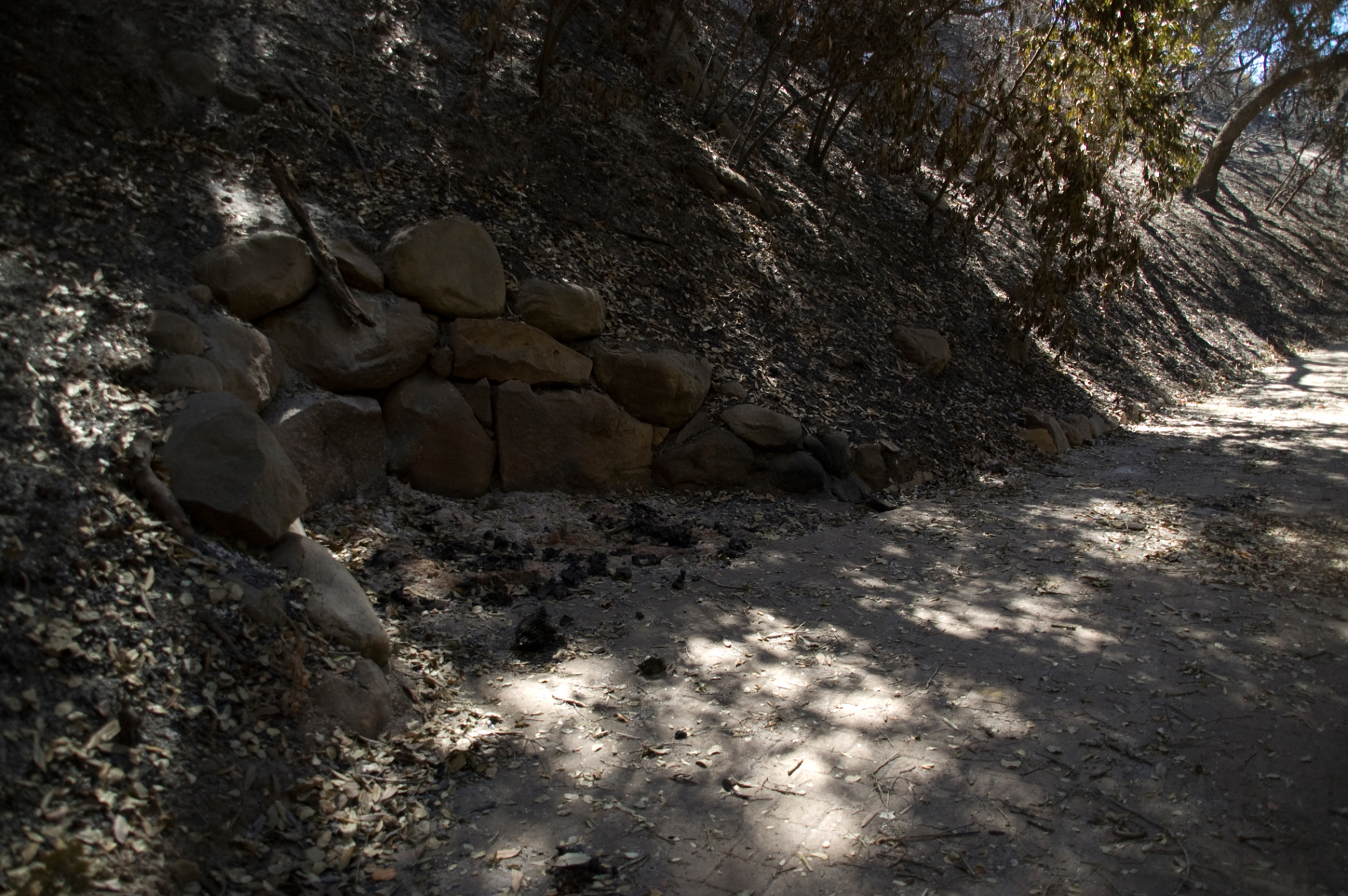 Santa Barbara Botanic Garden after the Jesusita Fire, ashes remaining from burned wood bench