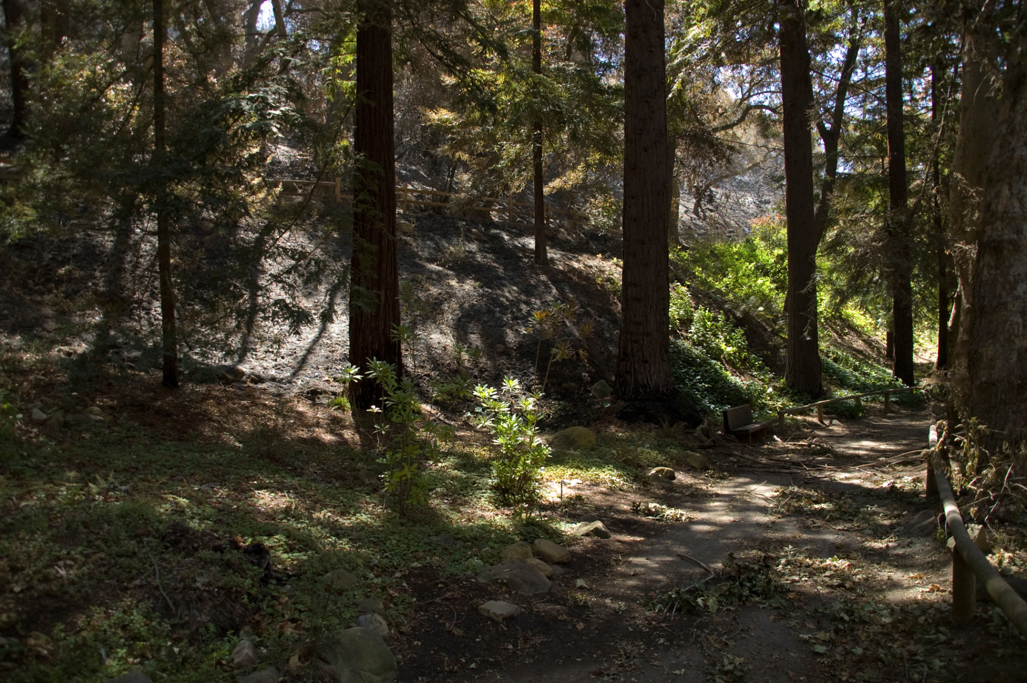 Santa Barbara Botanic Garden after the Jesusita Fire, burned area in Redwood section