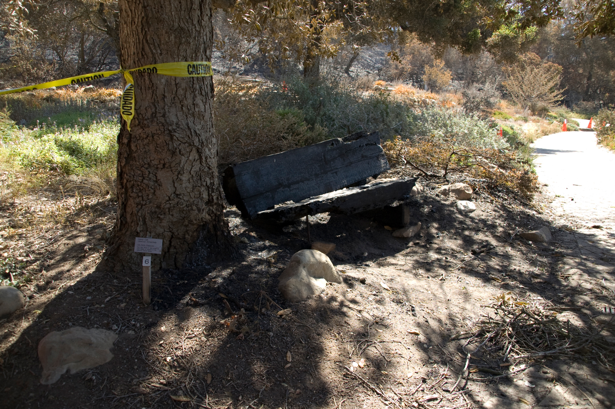 Santa Barbara Botanic Garden after the Jesusita Fire, burned wood bench