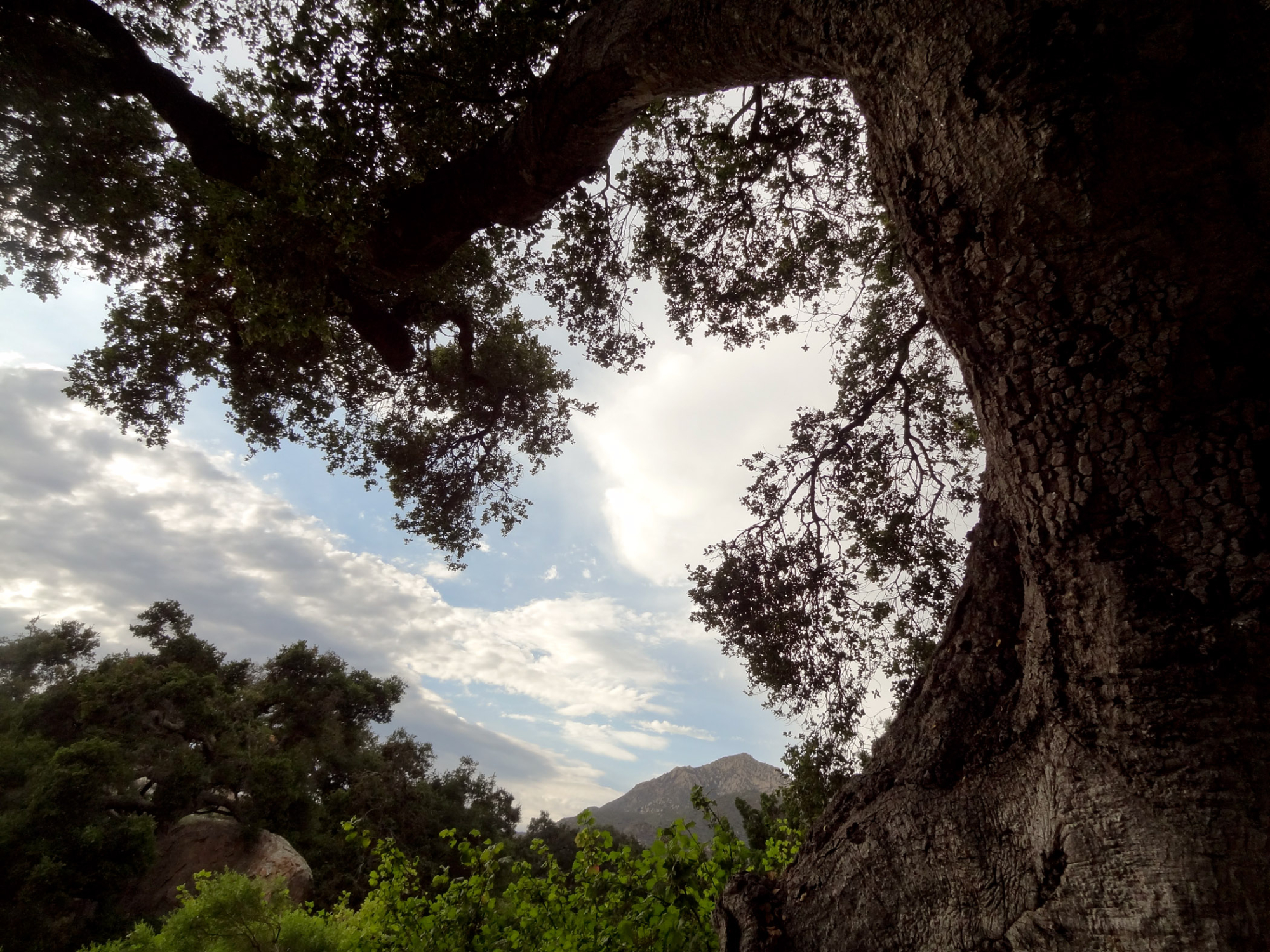 SBBG lower Meadow, monsoon clouds, late afternoon, natural window, view to mountains, Blaksley Boulder