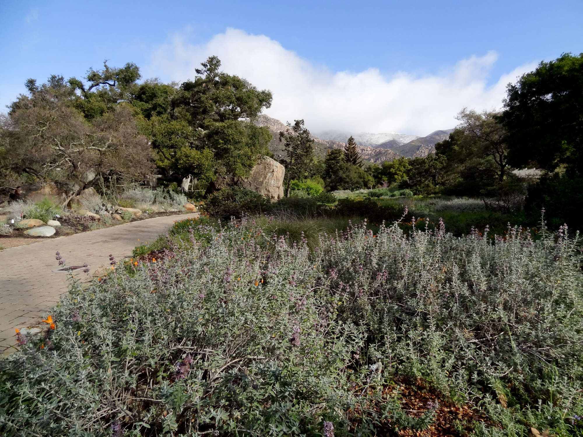 snow on the mountains, Blaksley Boulder, Meadow, Santa Barbara Botanic Garden