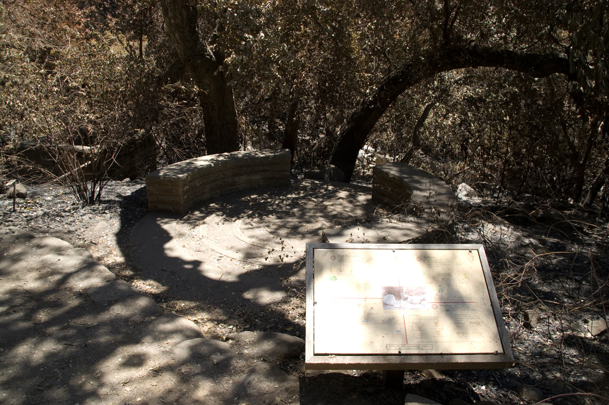 Spiral patio and circular stone bench in the Fiber Arts Display after the Jesusita Fire