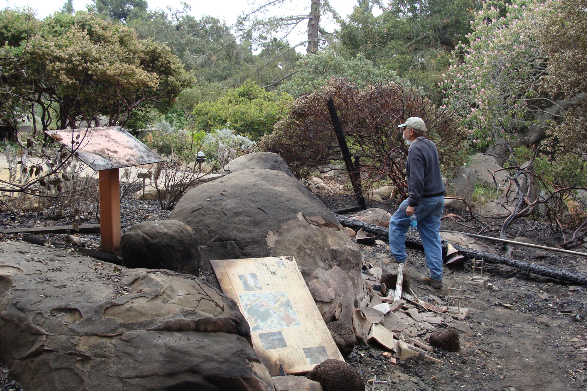 surveying the damage at the Home Demonstration Deck, Santa Barbara Botanic Garden, after the Jesusita Fire