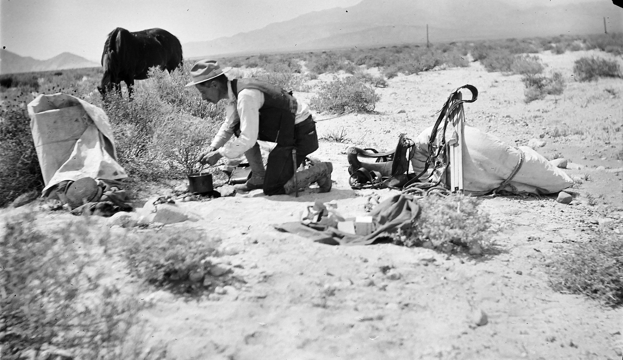 Palm Springs, man cooking at camp site, horse