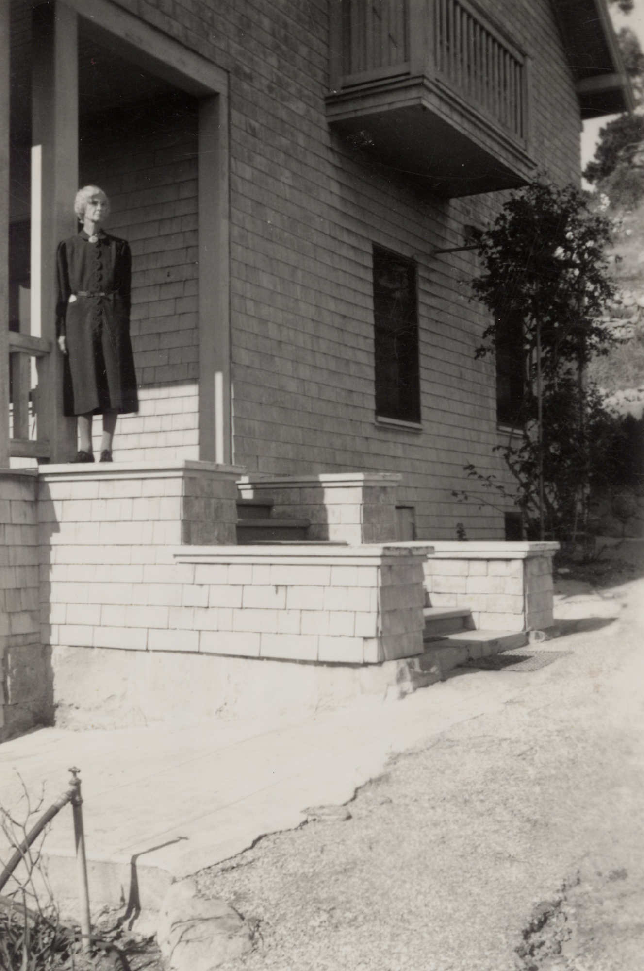 Mrs. (Dora?) George on the front porch, George House, Mission Canyon