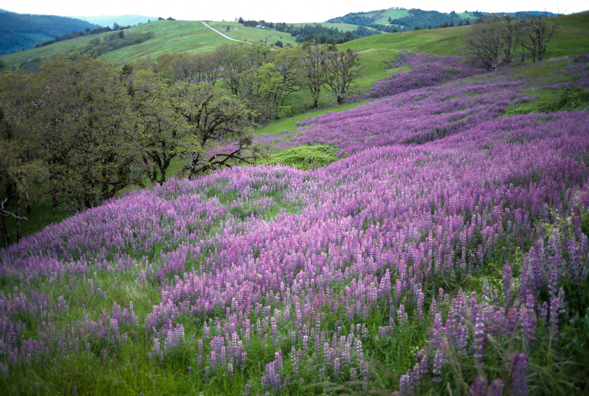 Coastal Prairie: Quercus garryana, Lupinus polyphylus (Lupine)?, Humboldt-Del Norte, May, Bald Hills Road, Redwood National Park, Humboldt County