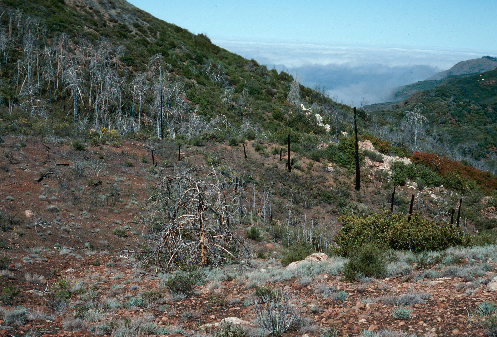 Cupressus sargentii , burned in 1985, N-facing slope, upper Villa Creek, Lions Den, Monterey County