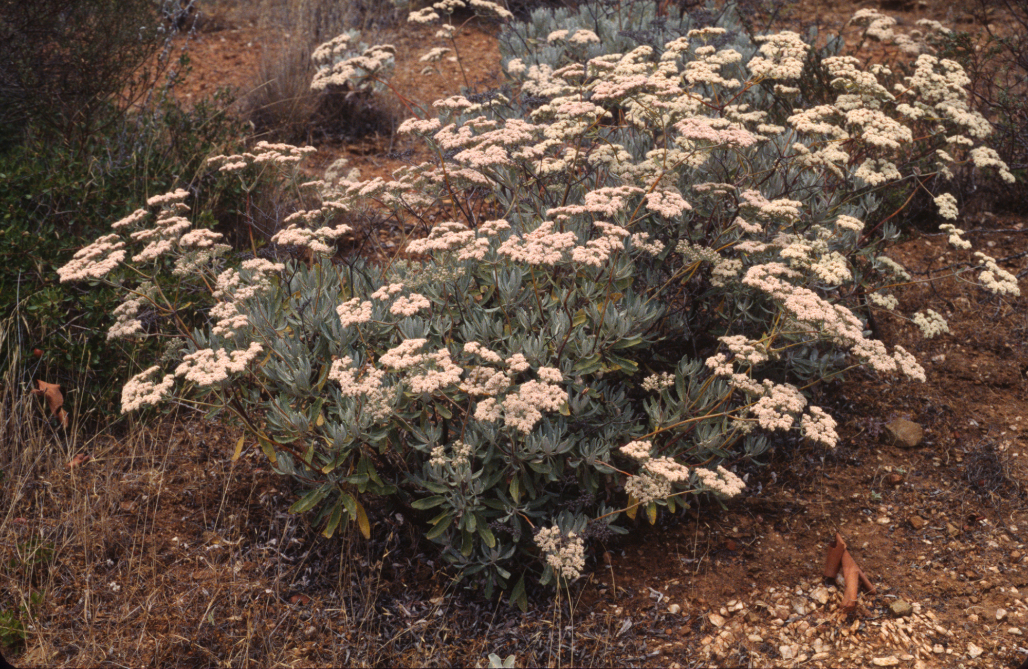 « back to search Eriogonum xblissianum Date July 10, 1996 Media FormatSlide PhotographerDieter H. Wilken Location Information Place Name Santa Cruz Island Country: United States State: California County: Santa Barbara Specific LocationSanta Cruz Island Plant Information Plant(s) Pictured (Eriogonum xblissianum) Primary Plant Part Whole Plant, Inflorescense, Flower Close-up Image & Format Details Decade1990s Photo OrientationLandscape Image & Format Tags Color photograph Collection Dieter Wilken Index NumberSL_01517