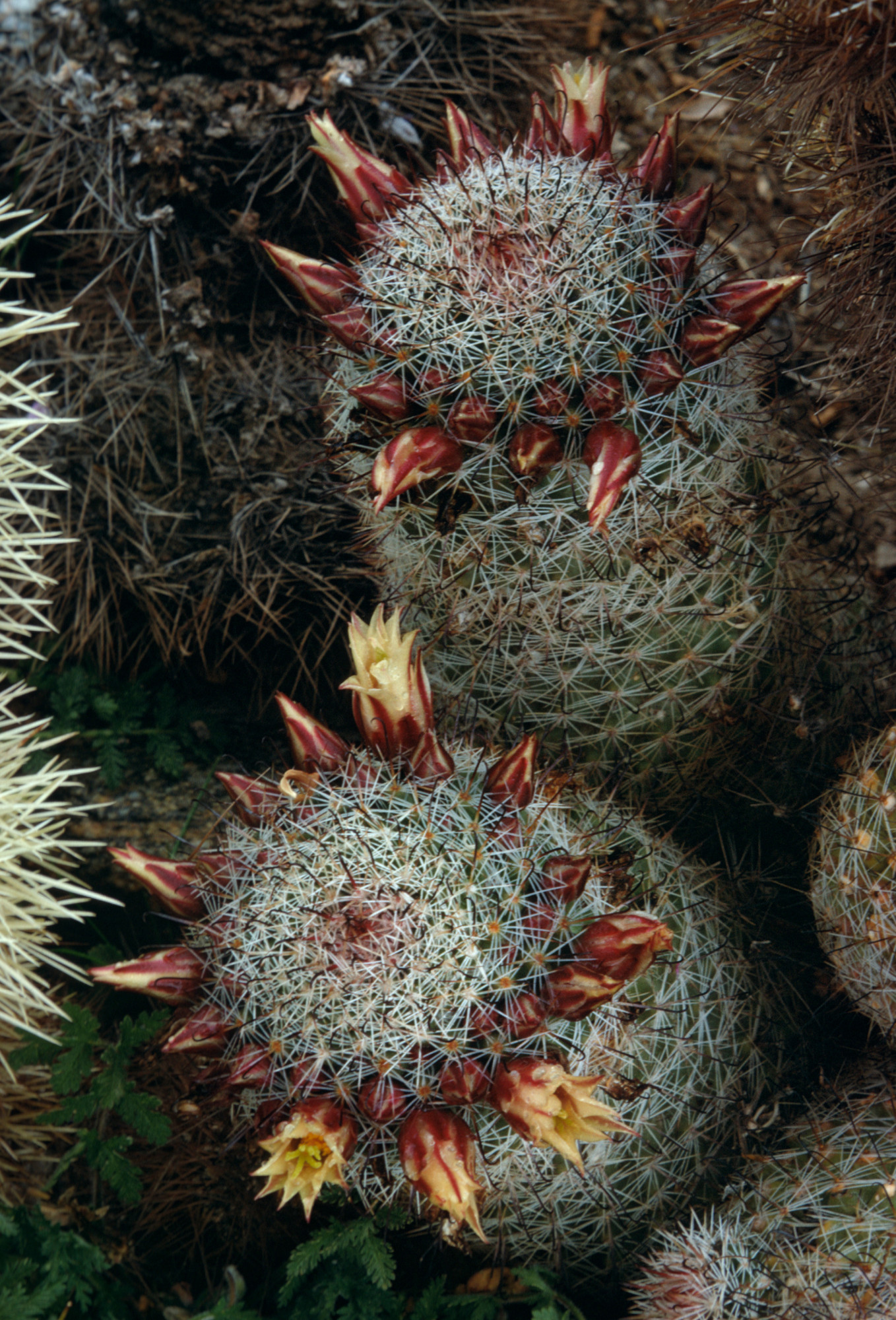 « back to search Mamillaria dioica Date March 1973 Media FormatSlide PhotographerBetty (Potts) Randall Location Information Place Name Anza-Borrego Desert State Park Country: United States State: California Plant Information Plant(s) Pictured Fish-hook Cactus (Mammillaria dioica) More Info Alternative Common NamesCactus, Fish Hook, Fish-hook Cactus, Strawberry Cactus Native StatusNative Plant Type/Growth FormShrub, Succulent Blooming PeriodWinter, Spring Plant Communities Chaparral, Mammillaria dioica, Desert, Woodland, Chaparral, Coastal Sage Scrub, Creosote Bush Scrub, Pinyon-Juniper Woodland Flower Color White, Yellow Primary Plant Part Inflorescense, Leaves, Whole Plant Image & Format Details Decade1970s Photo OrientationPortrait Image & Format Tags Color photograph Collection SBBG Library Archives Index NumberSL_18615