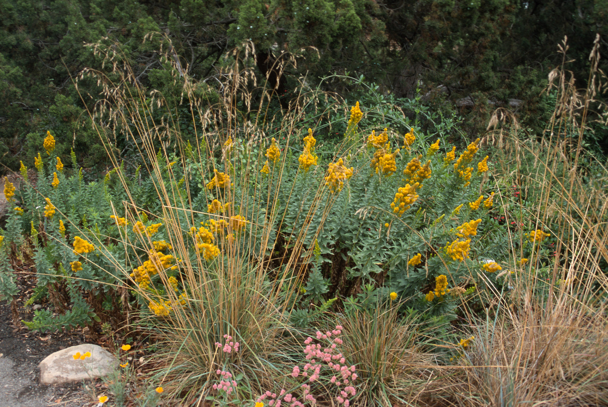 « back to search Solidago canadensis ssp. elongata with Festuca californica, SBBG cultivar, Plant Introduction Program Media FormatSlide PhotographerUnknown Location Information Place Name Santa Barbara Botanic Garden Country: United States State: California County: Santa Barbara Plant Information Plant(s) Pictured (Solidago canadensis ssp. elongata) California Fescue (Festuca californica) More Info Alternative Common NamesFescue, California Native StatusNative Plant Type/Growth FormGrass Blooming PeriodSpring, Winter Plant Communities Chaparral, Forest, Chaparral, Festuca californica, Mixed Evergreen Forest, Yellow Pine Forest Flower Color Yellow Primary Plant Part Whole Plant Image & Format Details Photo OrientationLandscape Collection SBBG Library Archives Index NumberSL_20443