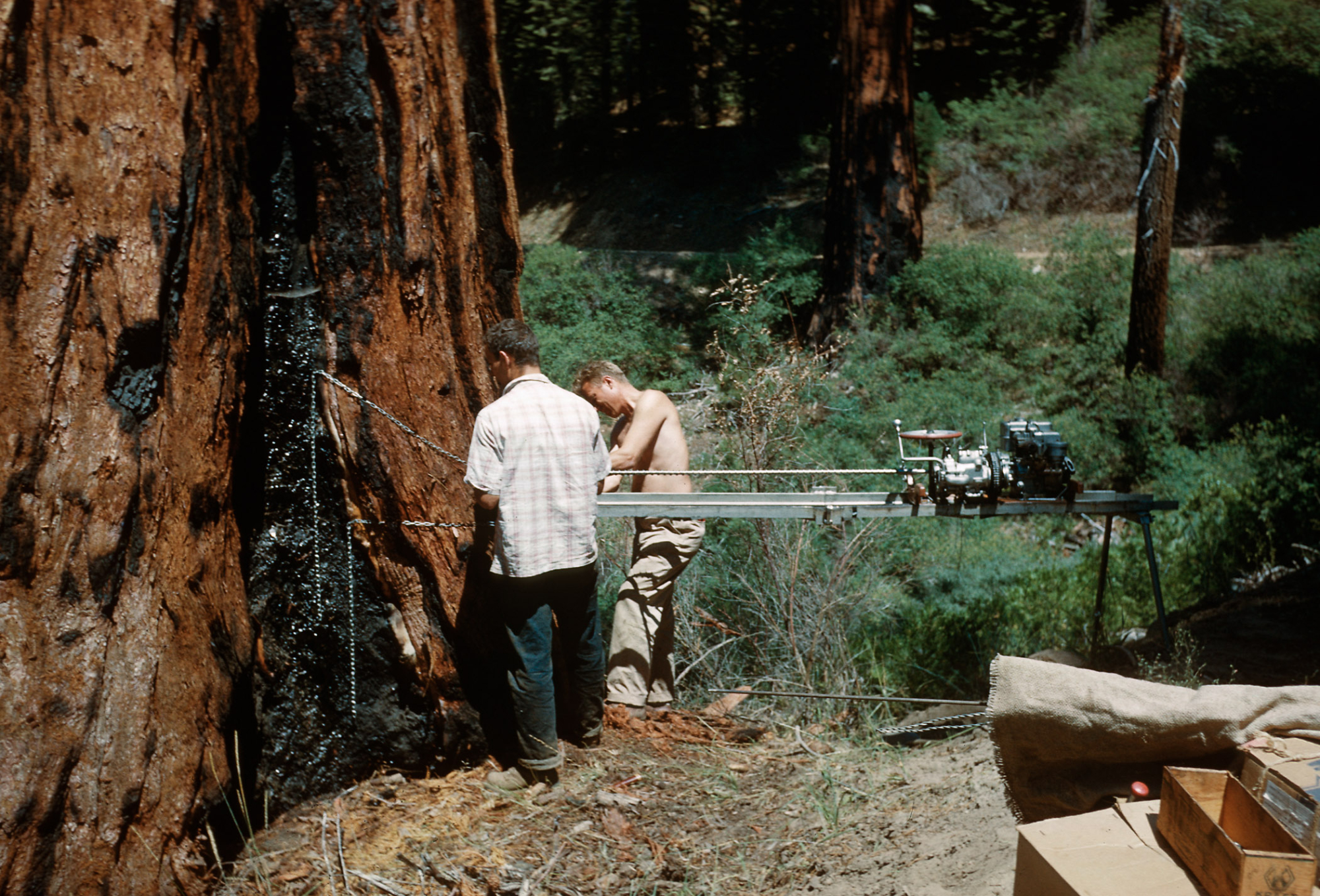 Tree coring, Santa Barbara Botanic Garden trip, Sequoia National Park, 1961
