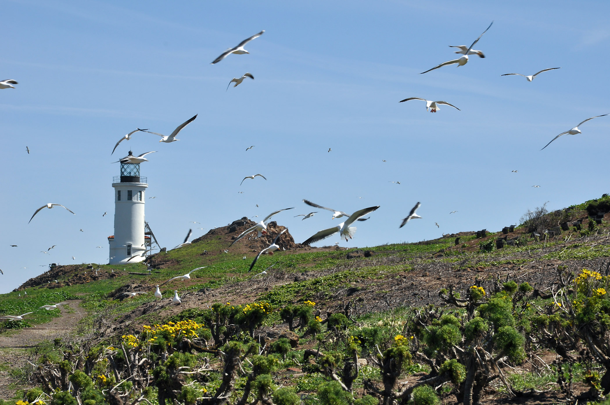 Anacapa Island Trip 2016-05, Seagulls flying, lighthouse, Coreopsis gigantea