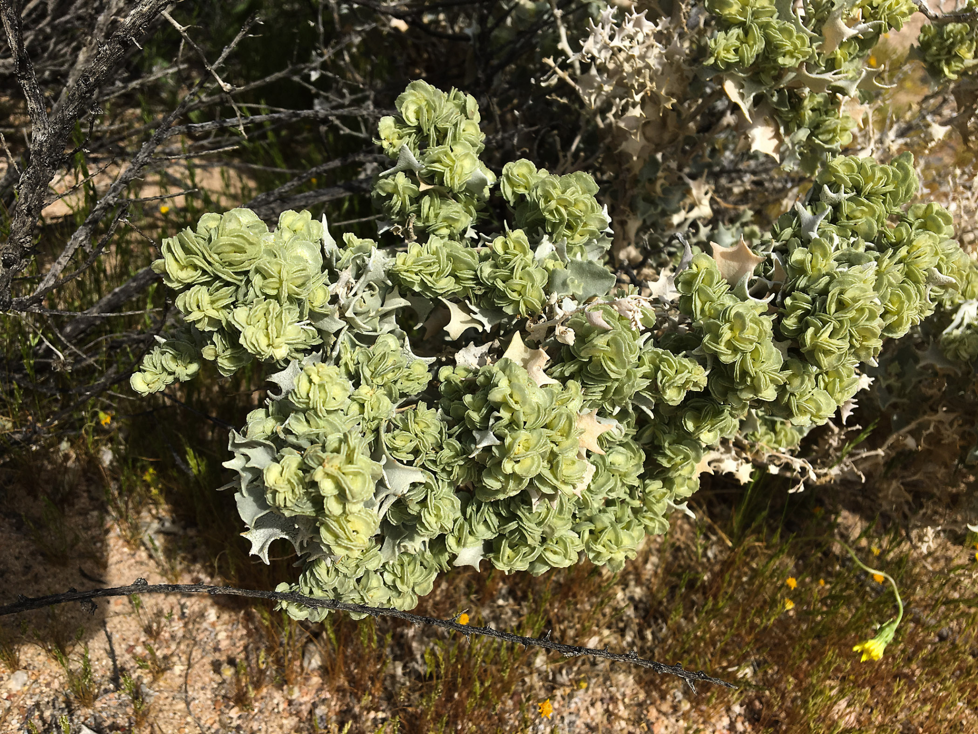 « back to search Atriplex hymenelytra, Red Rock Canyon, Kern county Date March 20, 2017 Media FormatBorn Digital PhotographerElizabeth (Betsy) Collins Location Information Place Name Red Rock Canyon Country: United States State: California County: Kern Plant Information Plant(s) Pictured Desert-holly (Atriplex hymenelytra) More Info Alternative Common NamesHolly, Desert|Saltbush, Desertholly, Desertholly, Yuma Desert Holly Native StatusNative Plant Type/Growth FormShrub Plant Communities Desert, Creosote Bush Scrub Primary Plant Part Whole Plant Image & Format Details Decade2010s Photo OrientationLandscape Image & Format Tags Color photograph Collection SBBG Born Digital Image Collection Index NumberBD_37258