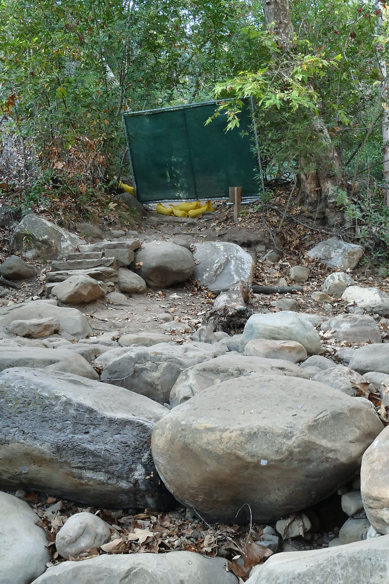 Barricade at lower creek crossing for Canyon Section closure during construction of the Backcountry