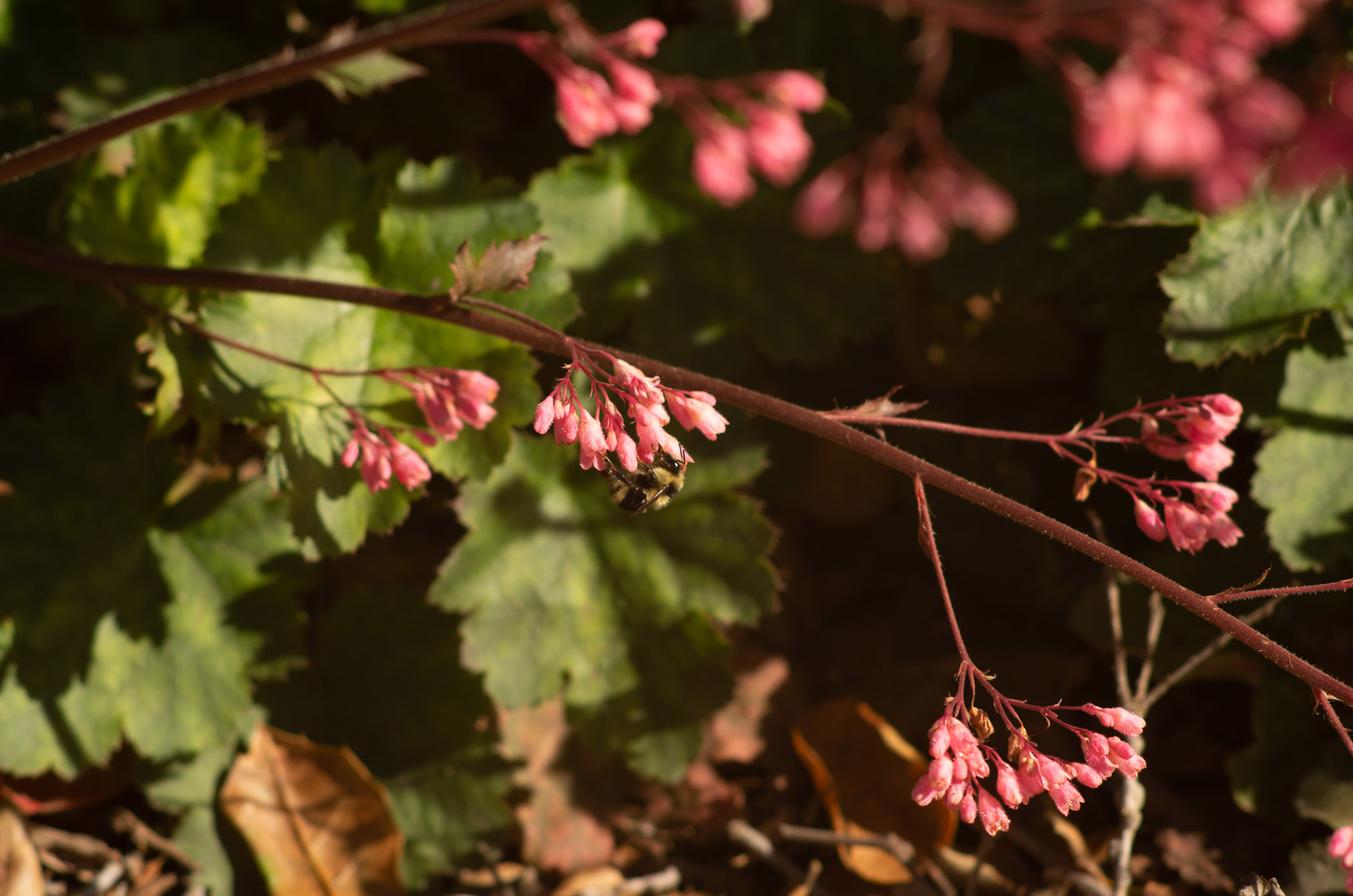 Black-tailed bumblebee (Bombus melanopygus) on Heuchera 'Wendy' in front of the Garden Shop