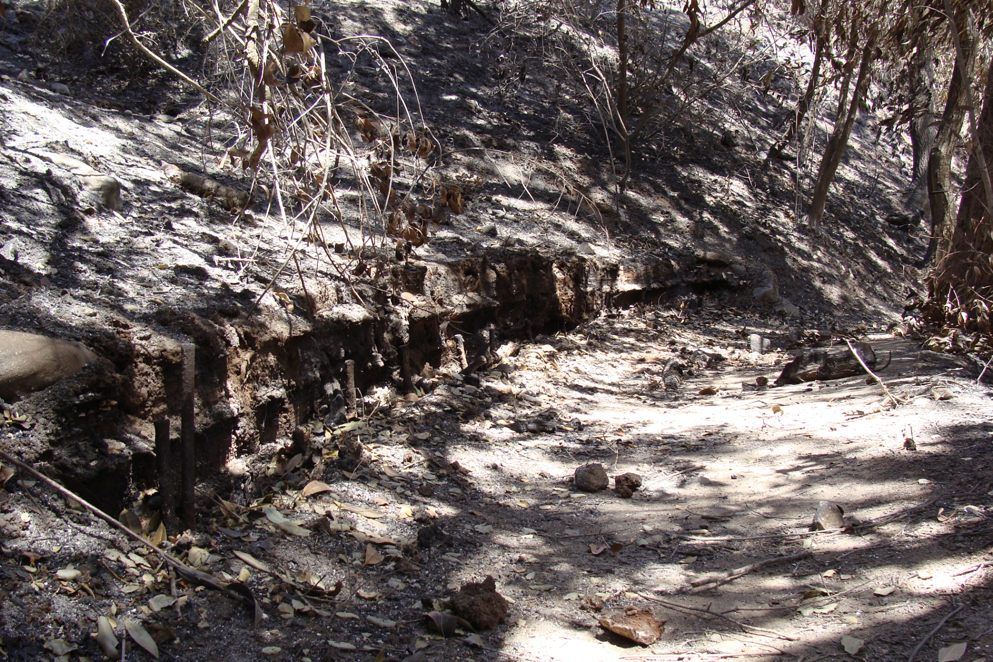 burned remains of wood retaining wall along the Pritchett Trail, after the Jesusita Fire
