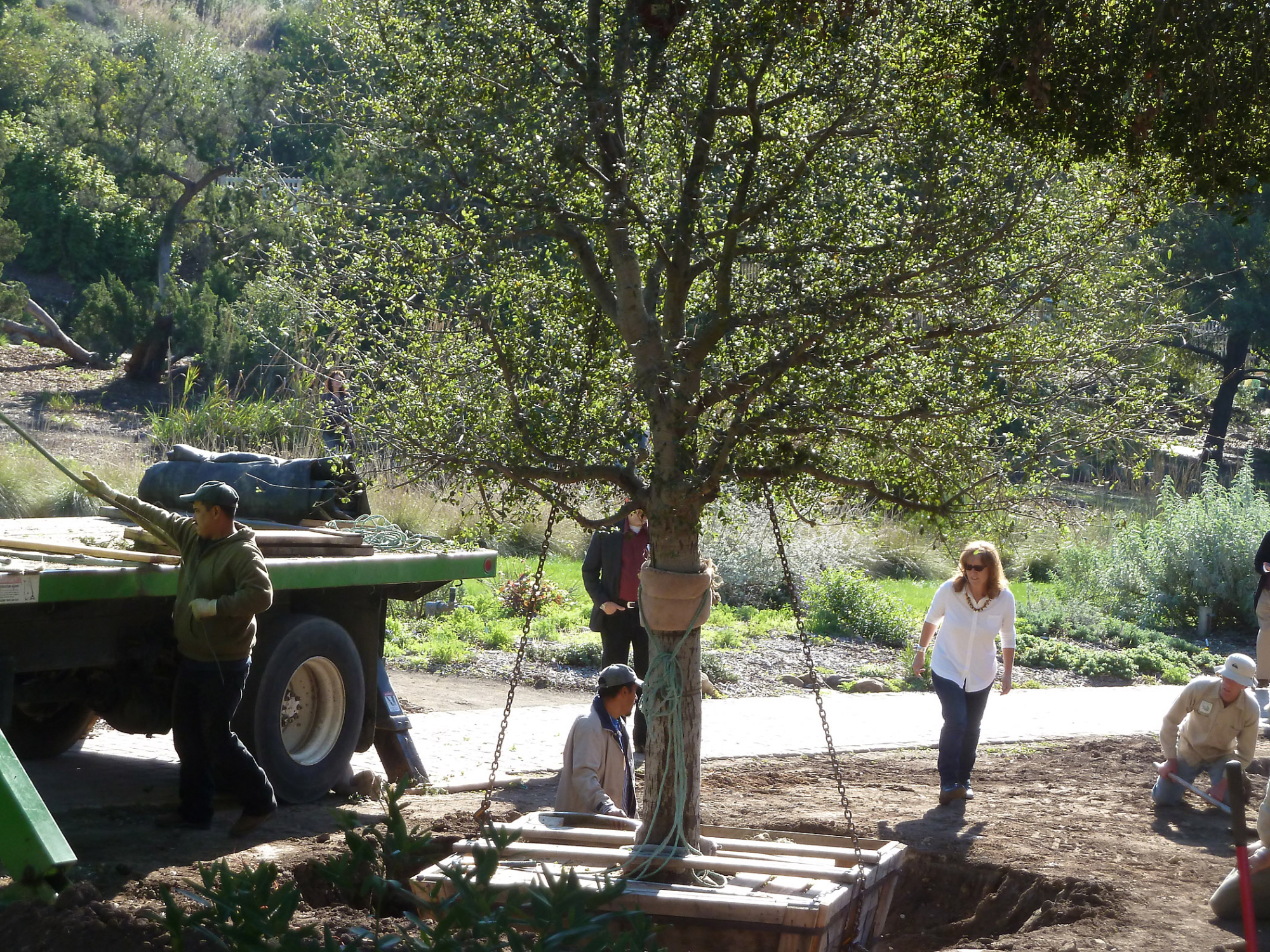 Delivery and placement of two new oak trees (Coastal Live Oak) in the Meadow Oaks display