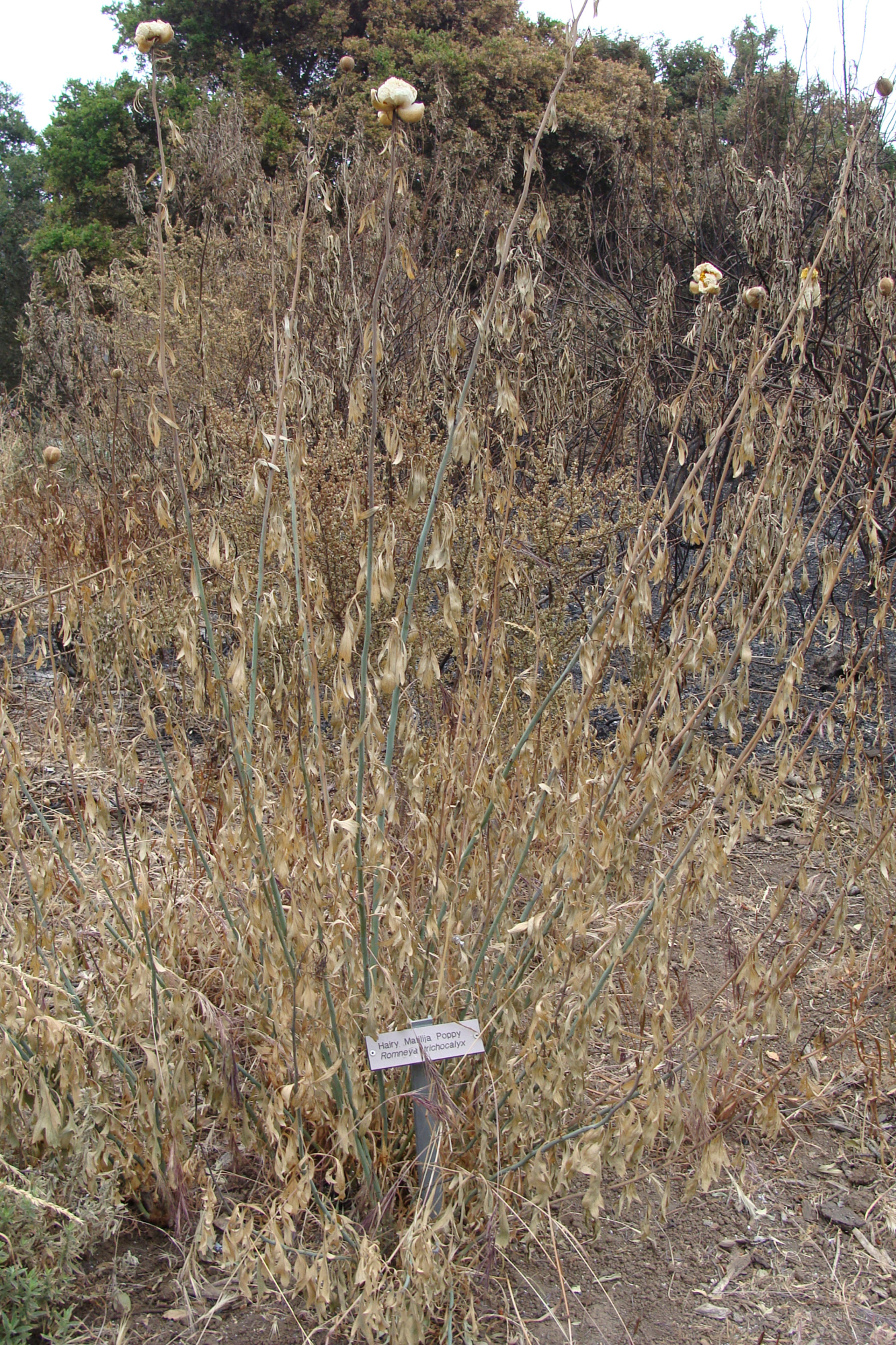 « back to search Hairy Matilija Poppy burned in the Jesusita Fire Date May 11, 2009 Media FormatBorn Digital PhotographerTricia Wardlaw Location Information Place Name Santa Barbara Botanic Garden Country: United States State: California County: Santa Barbara Santa Barbara Botanic Garden Garden Section/Display Porter Trail Plant Information Plant(s) Pictured Hairy Matilija Poppy (Romneya trichocalyx) More Info Alternative Common NamesPoppy, Bristly Matilija Native StatusNative Plant Type/Growth Formperennial herb Blooming PeriodSpring, Summer Plant Communities Chaparral, Romneya trichocalyx, Chaparral, Coastal Sage Scrub, Lowland Chaparral, Southern Coastal Scrub Flower Color White, Yellow Primary Plant Part Whole Plant Planted Landscapes/Horticultural Uses Garden Name (not SBBG)Santa Barbara Botanic Garden General Subject Subject Tags Fire: Burn Area Image & Format Details Decade2000s Photo OrientationPortrait Image & Format Tags Color photograph Collection Jesusita Fire Index NumberBD_02549