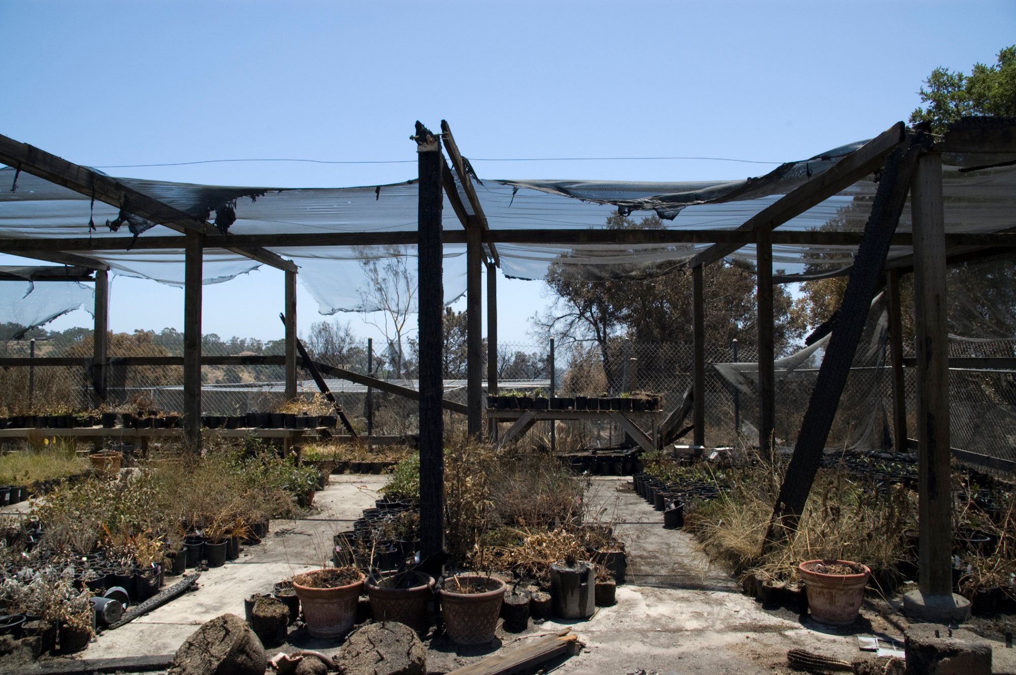 potted plants burned at the Horticulture Nursery growing area, after the Jesusita Fire