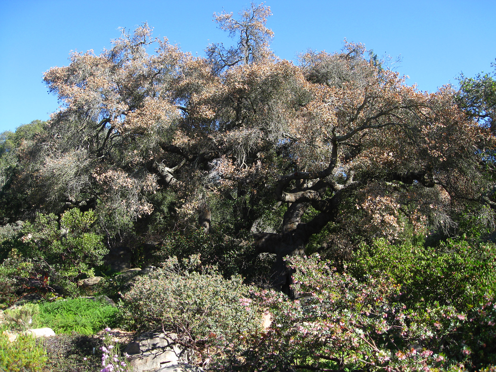 « back to search Quercus agrifolia in decline, Manzanita Section Date February 13, 2013 Media FormatBorn Digital PhotographerElizabeth (Betsy) Collins Location Information Place Name Santa Barbara Botanic Garden Country: United States State: California County: Santa Barbara City: Santa Barbara Plant Information Plant(s) Pictured Coast Live Oak (Quercus agrifolia) Šmuwič (Barbareño)kuẃ More Info Alternative Common NamesOak, Coast Live, California Live Oak Native StatusNative Plant Type/Growth FormTree Blooming PeriodSpring, Winter Plant Communities Woodland, Foothill Woodland, Southern Oak Woodland Flower Color Yellow, Green, Cream Image & Format Details Decade2010s Photo OrientationLandscape Image & Format Tags Color photograph Collection SBBG Born Digital Image Collection Index NumberBD_20858