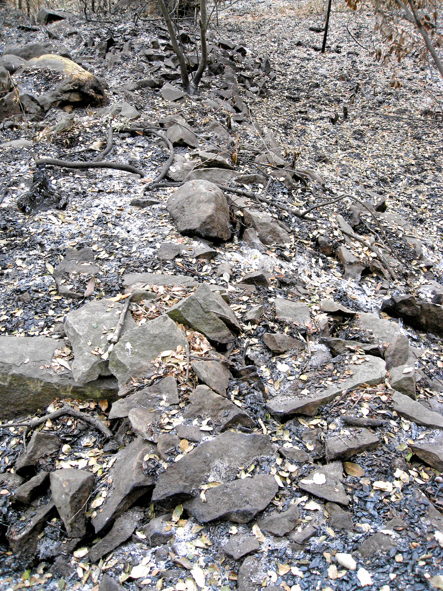Santa Barbara Botanic Garden after the Jesusita Fire. Piles of old quarry tailings in the Canyon