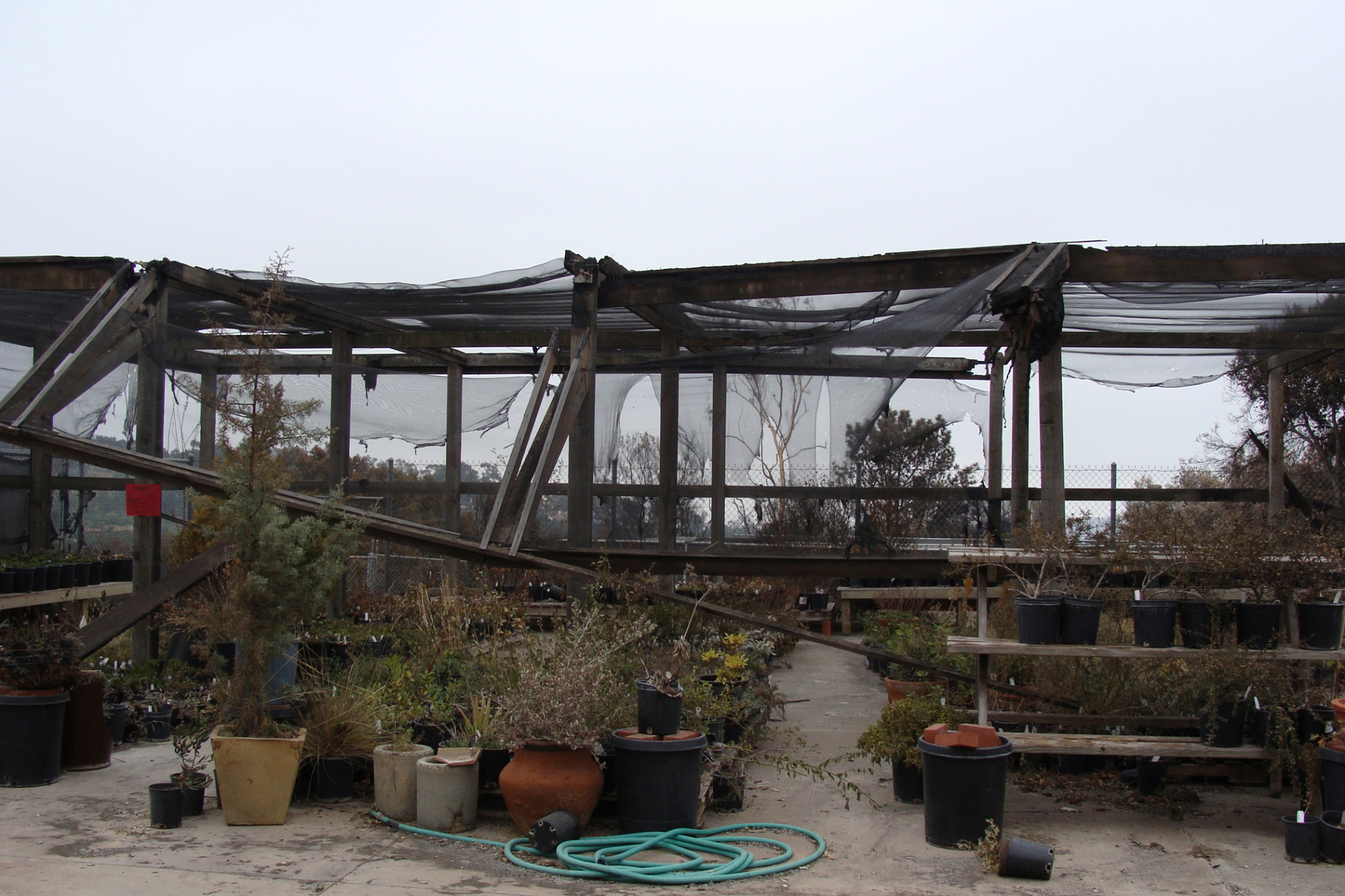 shade structure and potted plants at the Hort Unit, after the Jesusita Fire