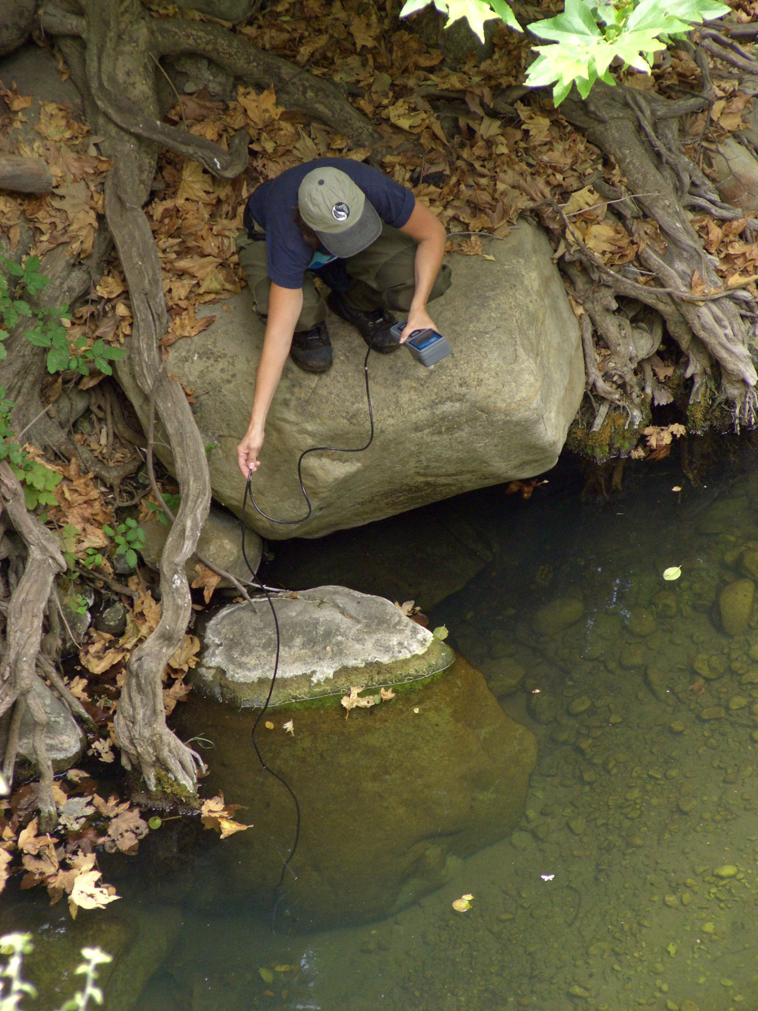 Steelhead trout release below Mission Dam. Gaytha Morningstar checks water temperature and oxygen content.