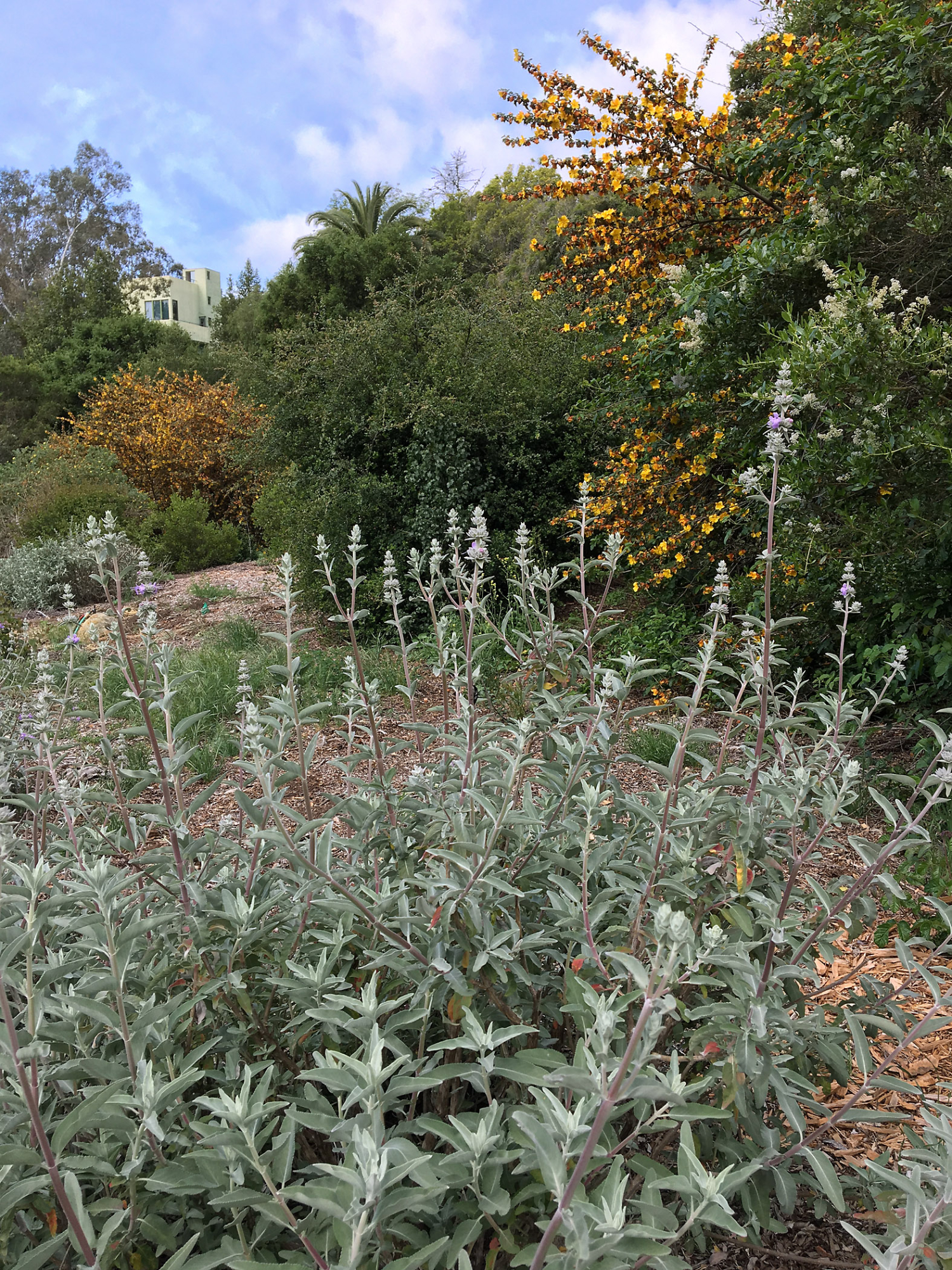 Tunnel Triangle, Salvia (Sage) Desperado with Fremontodendron (Flannelbush)in background