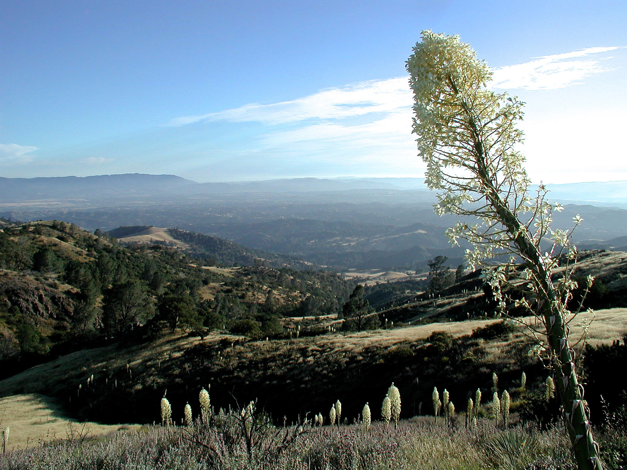« back to search Yucca in bloom, valley view, Santa Ynez Valley, SBBG Photo Contest 2013 Date 2013 Media FormatBorn Digital PhotographerMary Jane Delgado Location Information Place Name Santa Ynez Valley Plant Information Plant(s) Pictured Mojave Yucca (Yucca schidigera) More Info Alternative Common NamesYucca, Mojave, Izote De Ensenada, Spanish Dagger Native StatusNative Plant Type/Growth FormShrub, Succulent Blooming PeriodSpring Plant Communities Chaparral, Desert, Chaparral, Creosote Bush Scrub Flower Color Cream, White Primary Plant Part Whole Plant Image & Format Details Decade2010s Photo OrientationLandscape Image & Format Tags Color photograph Collection SBBG Born Digital Image Collection Index NumberBD_14162