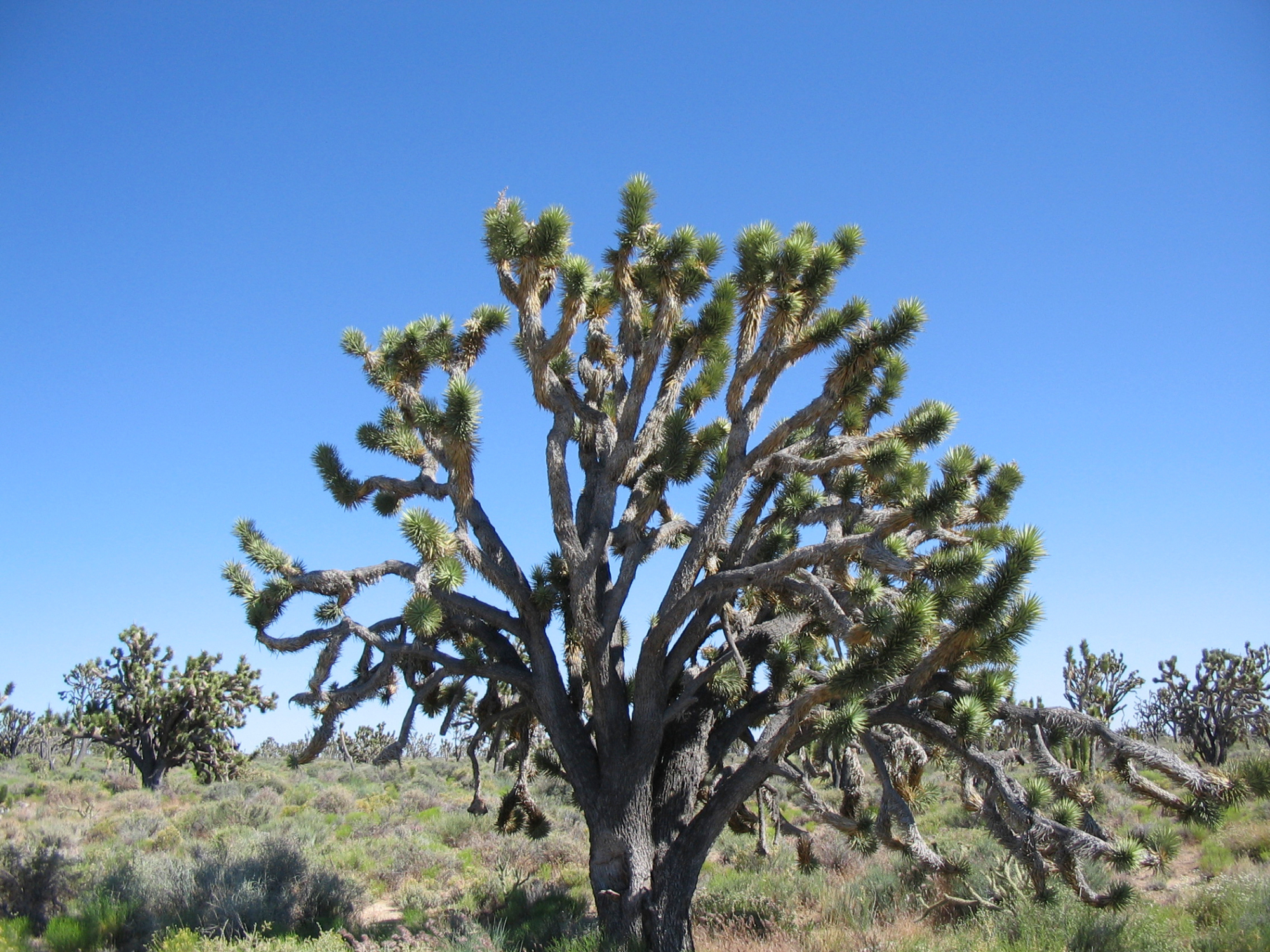 « back to search Yucca brevifolia, Sunshine Road ~0.5 miles northeast of Cima Rd Date June 21, 2005 Media FormatBorn Digital PhotographerElizabeth (Betsy) Collins Location Information Specific LocationSunshine Rd., E of Cima Rd. Plant Information Plant(s) Pictured Joshua Tree (Yucca brevifolia) More Info Alternative Common NamesIzote De Desierto, Joshua Tree Woodland Native StatusNative Plant Type/Growth FormShrub, Succulent Blooming PeriodSpring Plant Communities Desert, Joshua Tree Woodland Flower Color Green, White Primary Plant Part Whole Plant Natural Landscapes General Habitat Deserts Image & Format Details Decade2000s Photo OrientationLandscape Image & Format Tags Color photograph Index NumberBD_02405