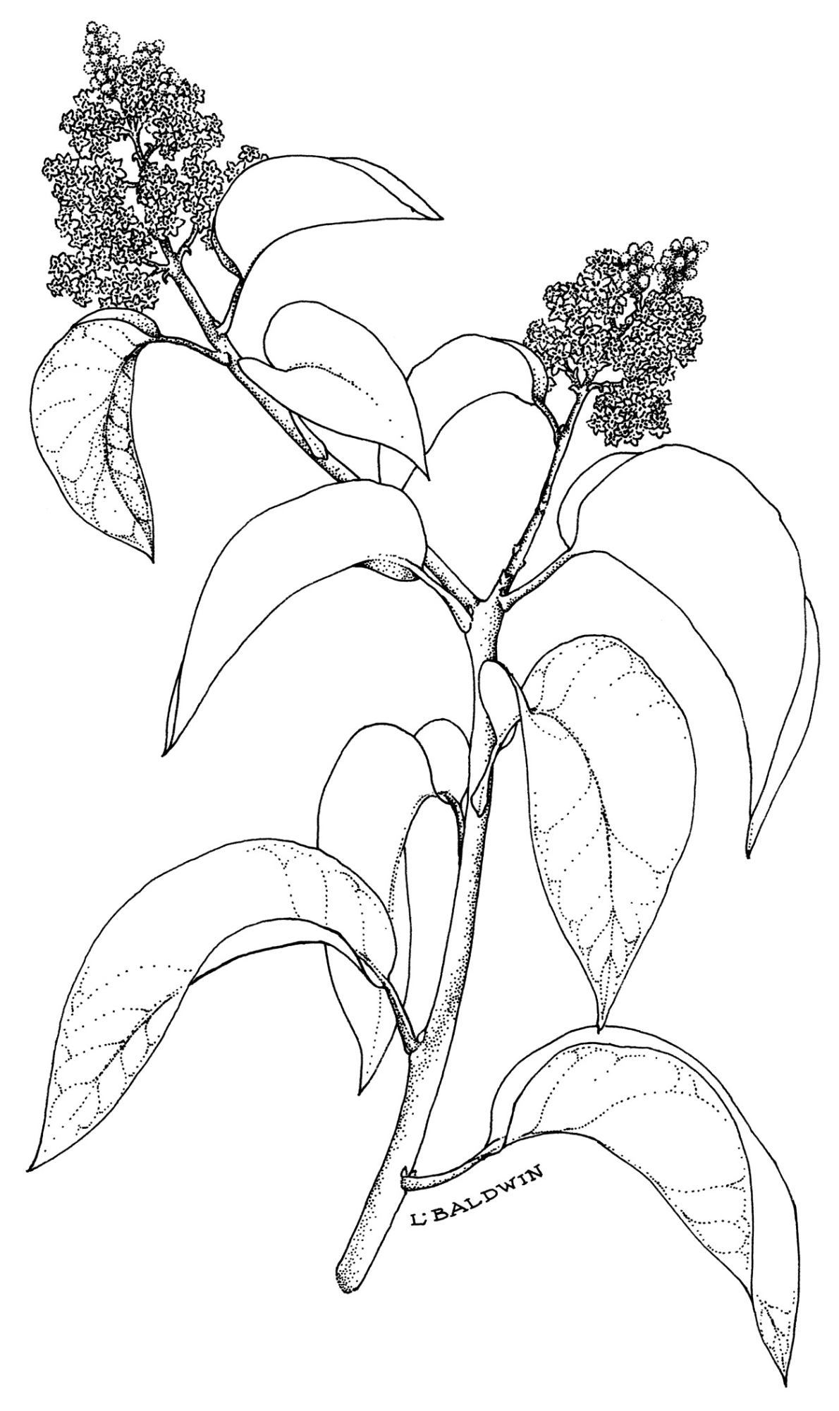 « back to search Sugar Bush Date January 1, 2001 Media FormatLine Art ArtistL. Baldwin MediumInk on paper Plant Information Plant(s) Pictured Sugar Bush (Rhus ovata) More Info Alternative Common NamesSumac, Sugar, Sugar Sumac Native StatusNative Growth FormShrub Primary Plant Part Inflorescense, Leaves, Stems/Branches/Trunk Image & Format Details DigitizedYes Decade1980s Collection SBBG Media Index NumberLA_00084